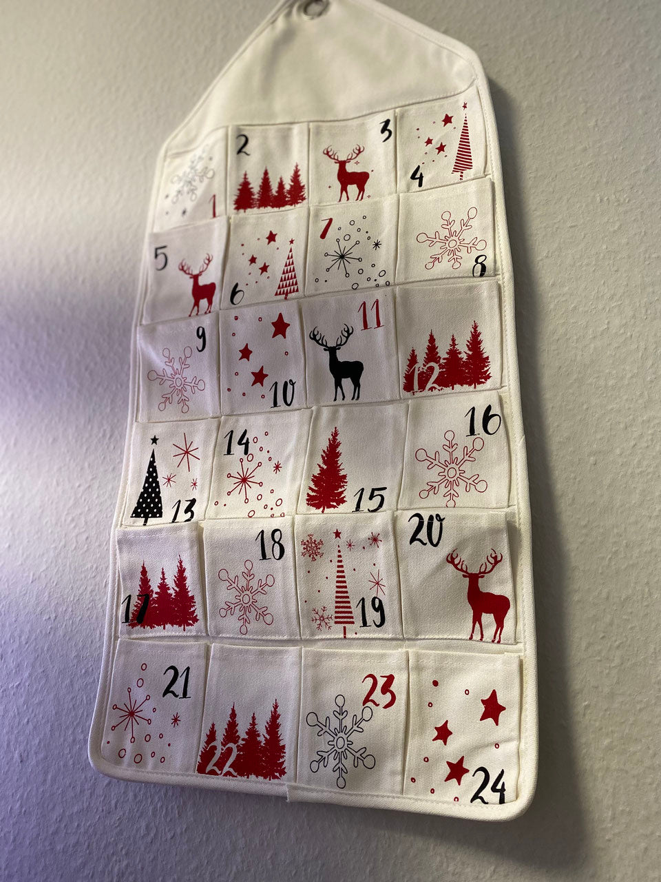 Adventskalender nicht waschen, nicht bleichen, nicht bügeln, nicht Trockner geeignet, nicht chemisch reinigen.