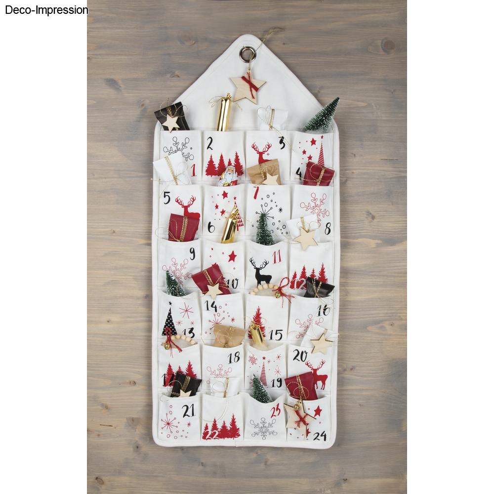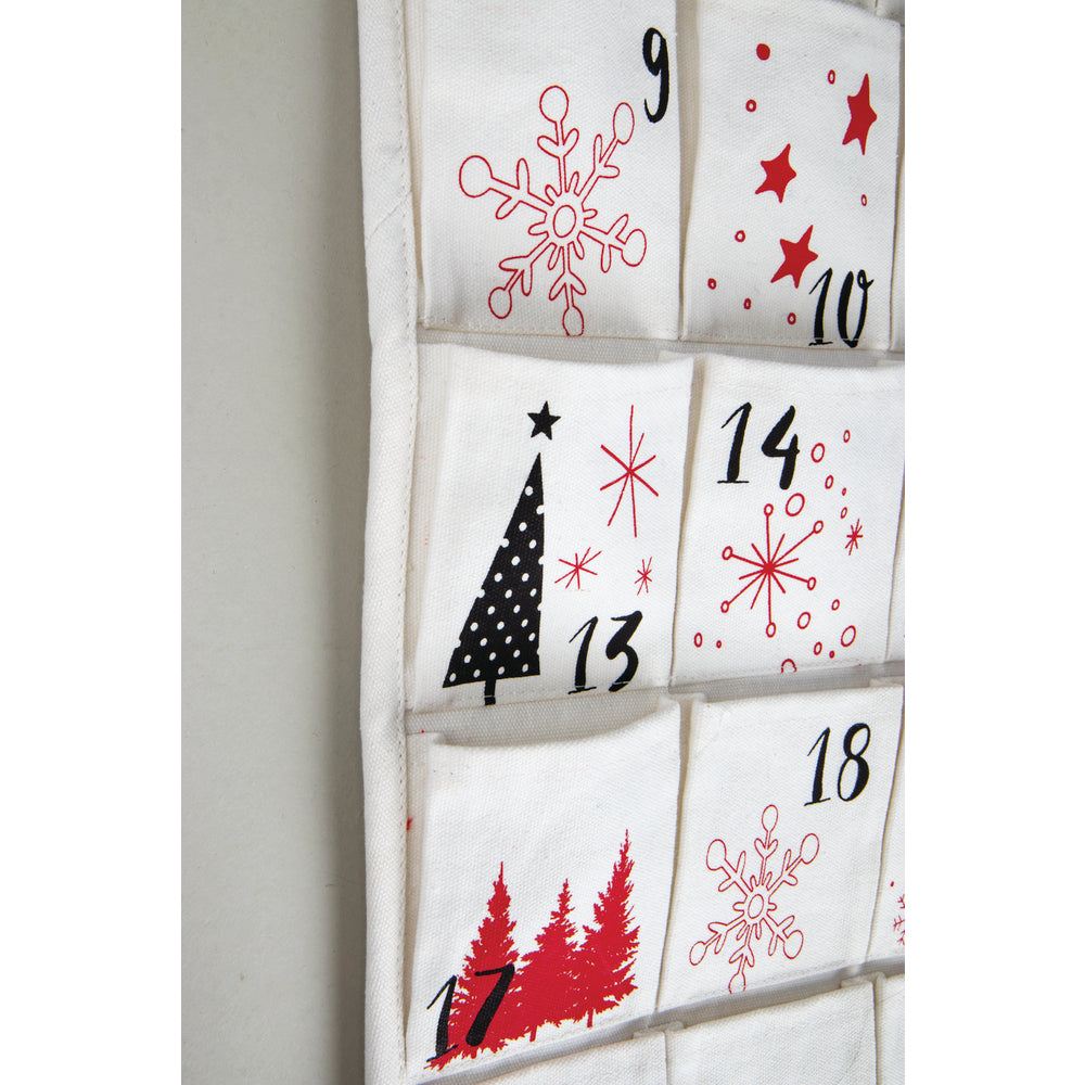 Hochwertig verarbeiteter Adventskalender zum Aufhängen, 36 x 82 cm, mit 24 Taschen, gefertigt aus 100% Baumwoll-Canvas und mit weihnachtlichen Motiven bedruckt. Die Rückseite ist mit Filz (100% Polyester) gecovert.