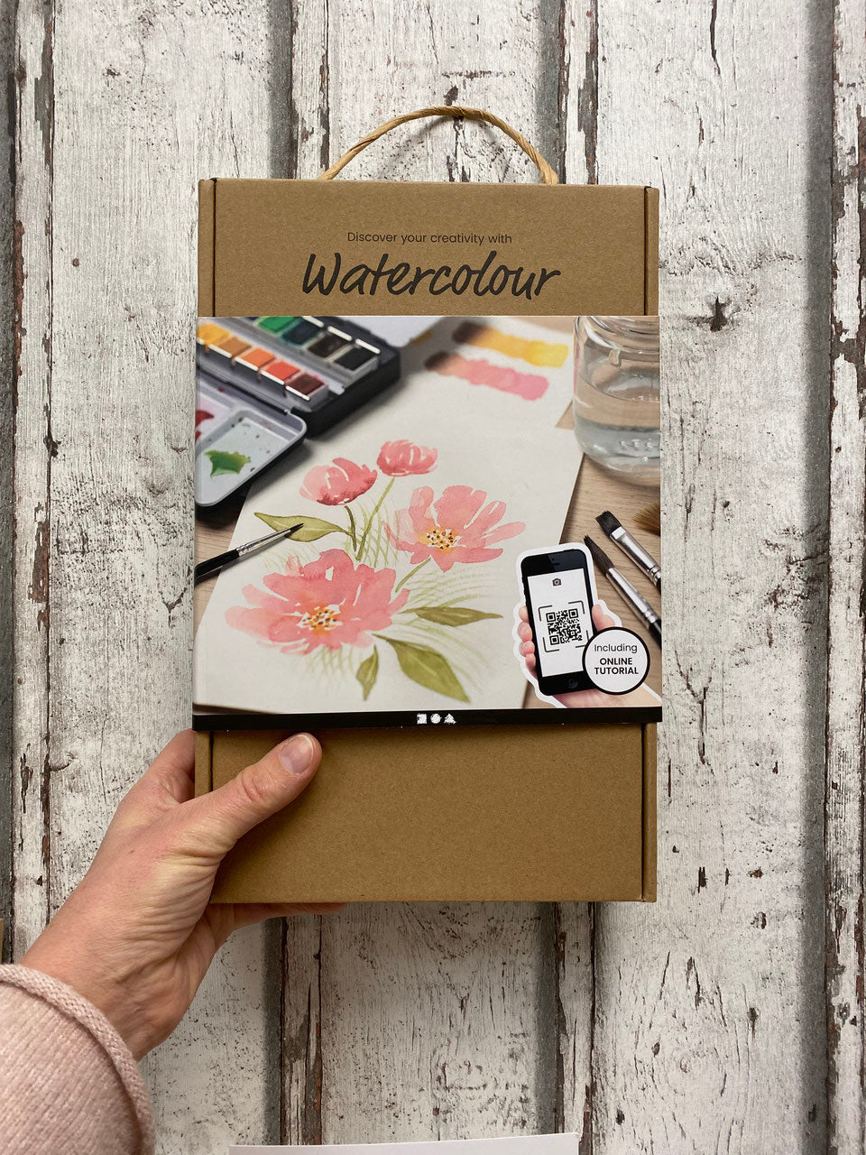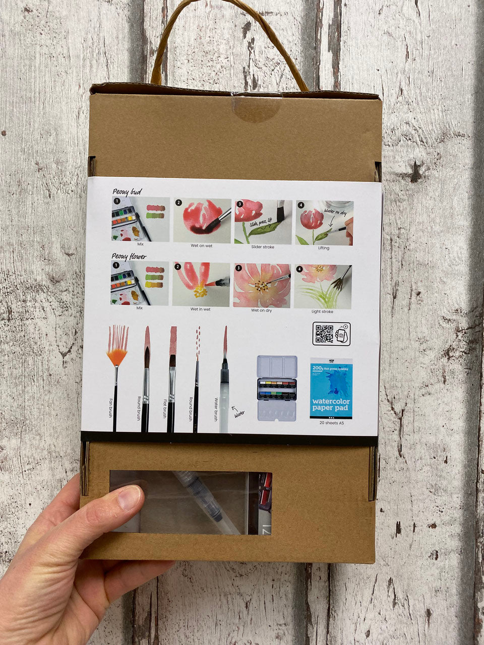 Aquarellblock A5 200 g , Fächerpinsel, Flach-, Spitz- und Feinpinsel, Aquarellkasten 12 Farben und Wassertankpinsel