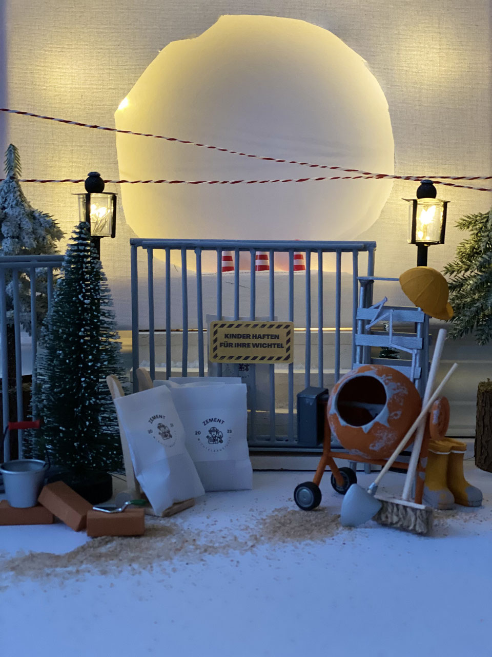 Keilrahmen 40cm x 40cm (für Loch in der Wand), Lichterkette, Tonkartonrückwand, Schaumpads, 5 Papiertüten weiß mit Aufkleber zum Befüllen, Baustellenband, Sackkarre, Gummistiefel gelb, Sand