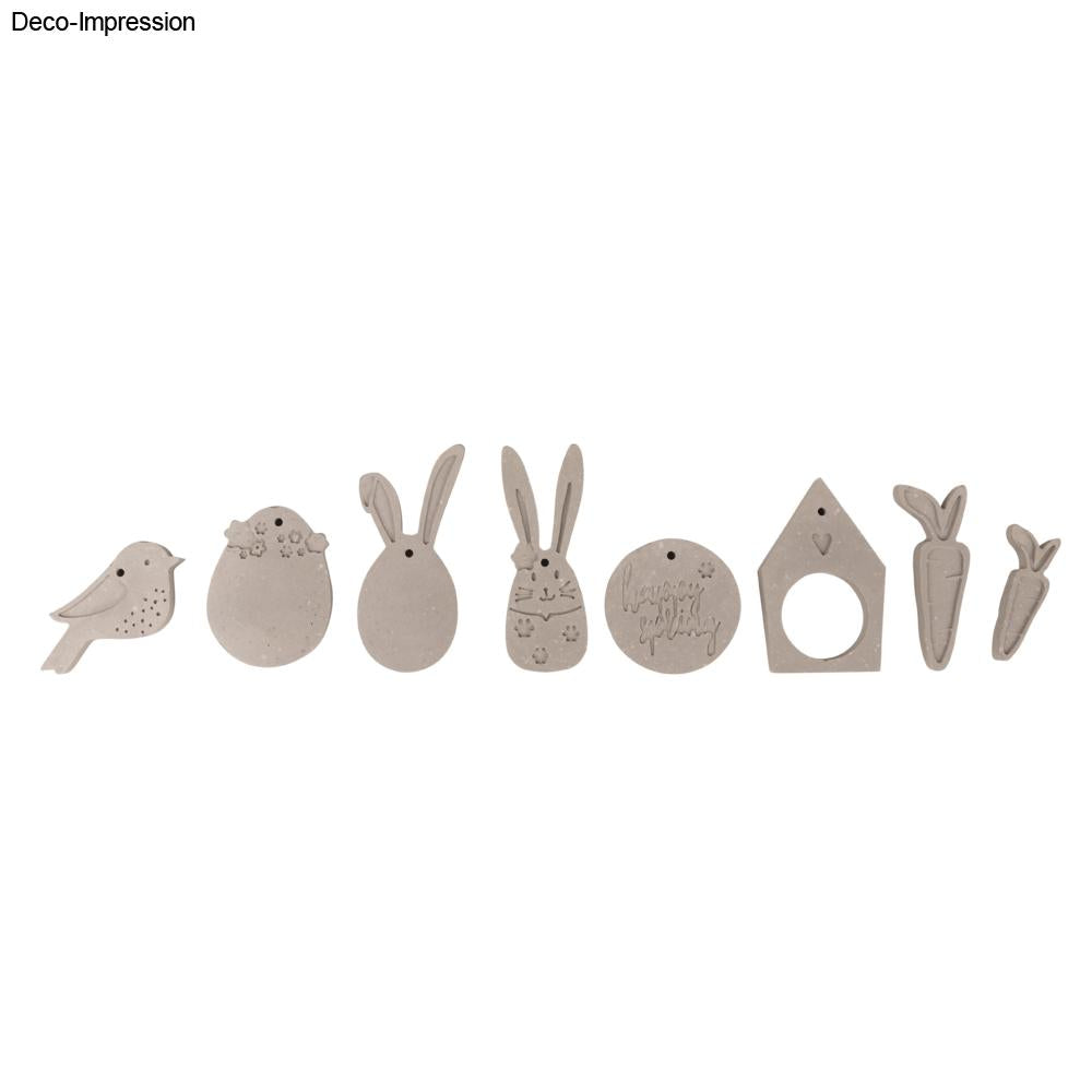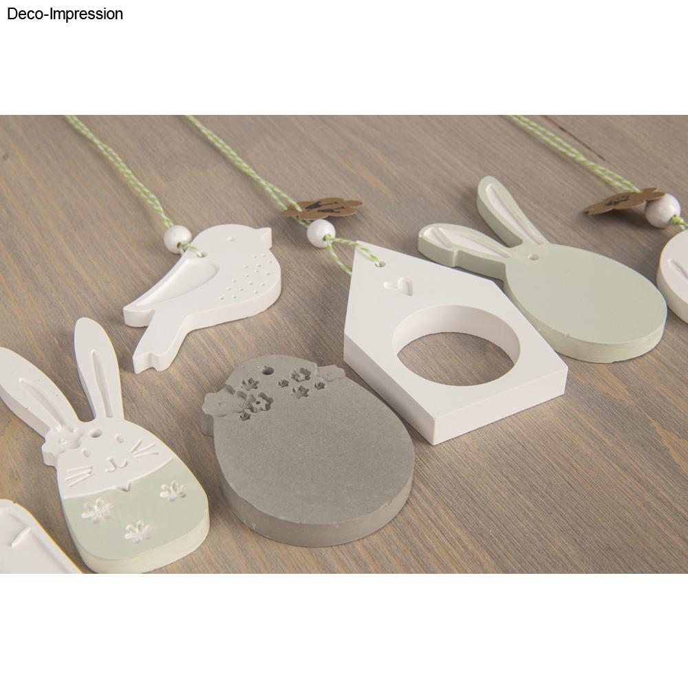 Maße der Motive: Vogel 45 x 45 mm, Osterei 45 x 60 mm, Schlappohr-Hase 37 x 85 mm, Hase 30 x 85 mm, runder Anhänger mit Text „Happy Spring“ 50 mm ø, Haus 45 x 72 mm, kleine Möhre 20 x 50 mm, große Möhre 25 x 70 mm, Tiefe je 9 mm.