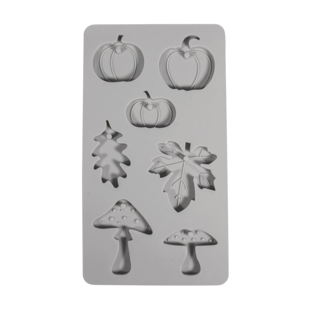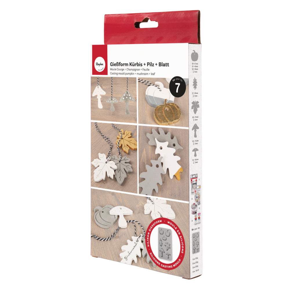 Silikon-Gießform 26 x 14,5 x 1 cm, 7 verschiedene Motive. Maße: Kürbis groß 56 x 57 mm, Kürbis mittel 52 x 49 mm, Kürbis klein 50 x 38 mm, Blatt Eichel 37 x 68 mm, Blatt Ahorn 69 x 70 mm, Pilz groß 60 x 75 mm, Pilz klein 54 x 46 mm, maximale Höhe 9 mm.