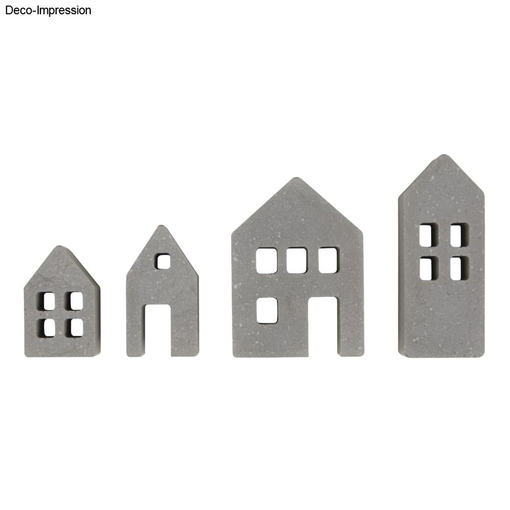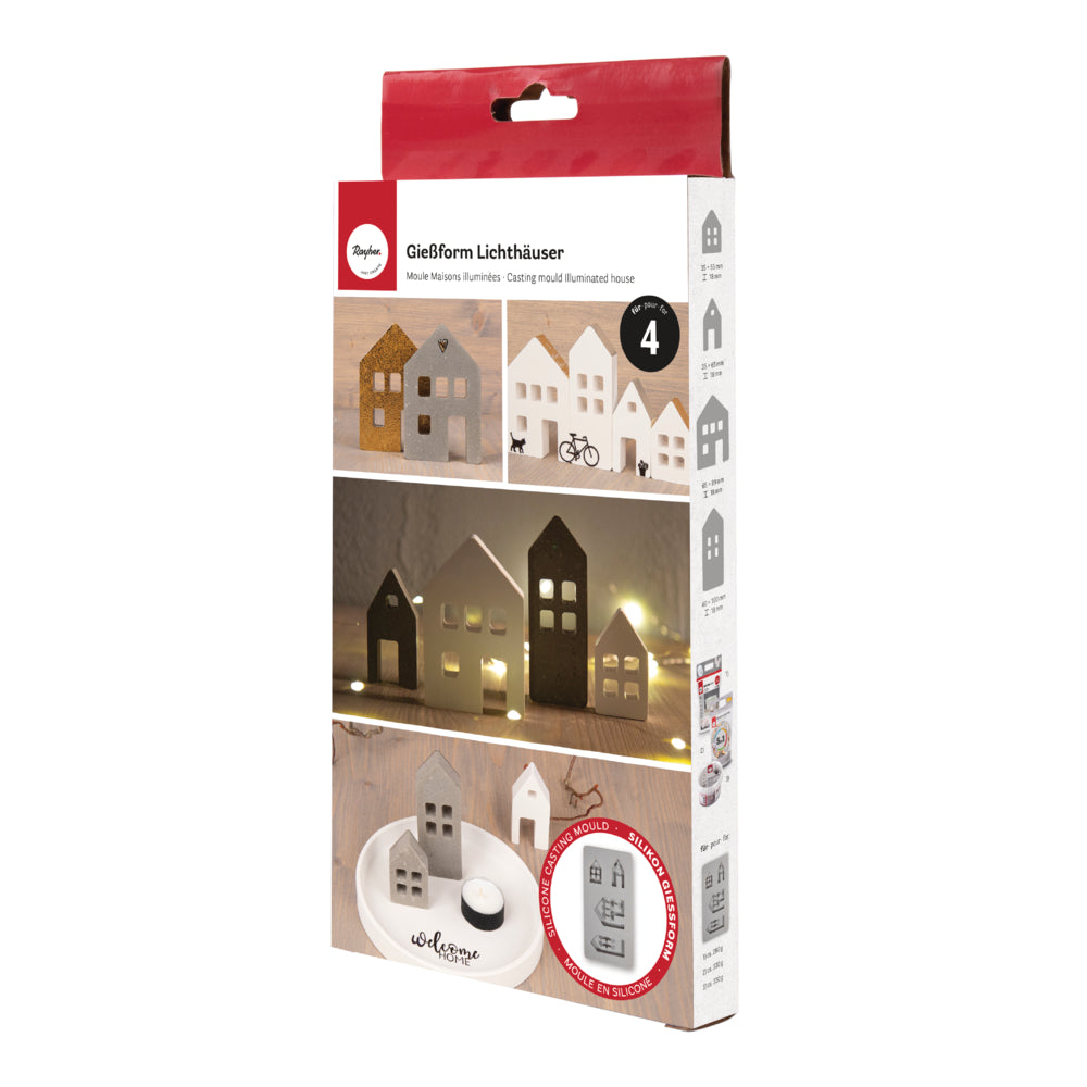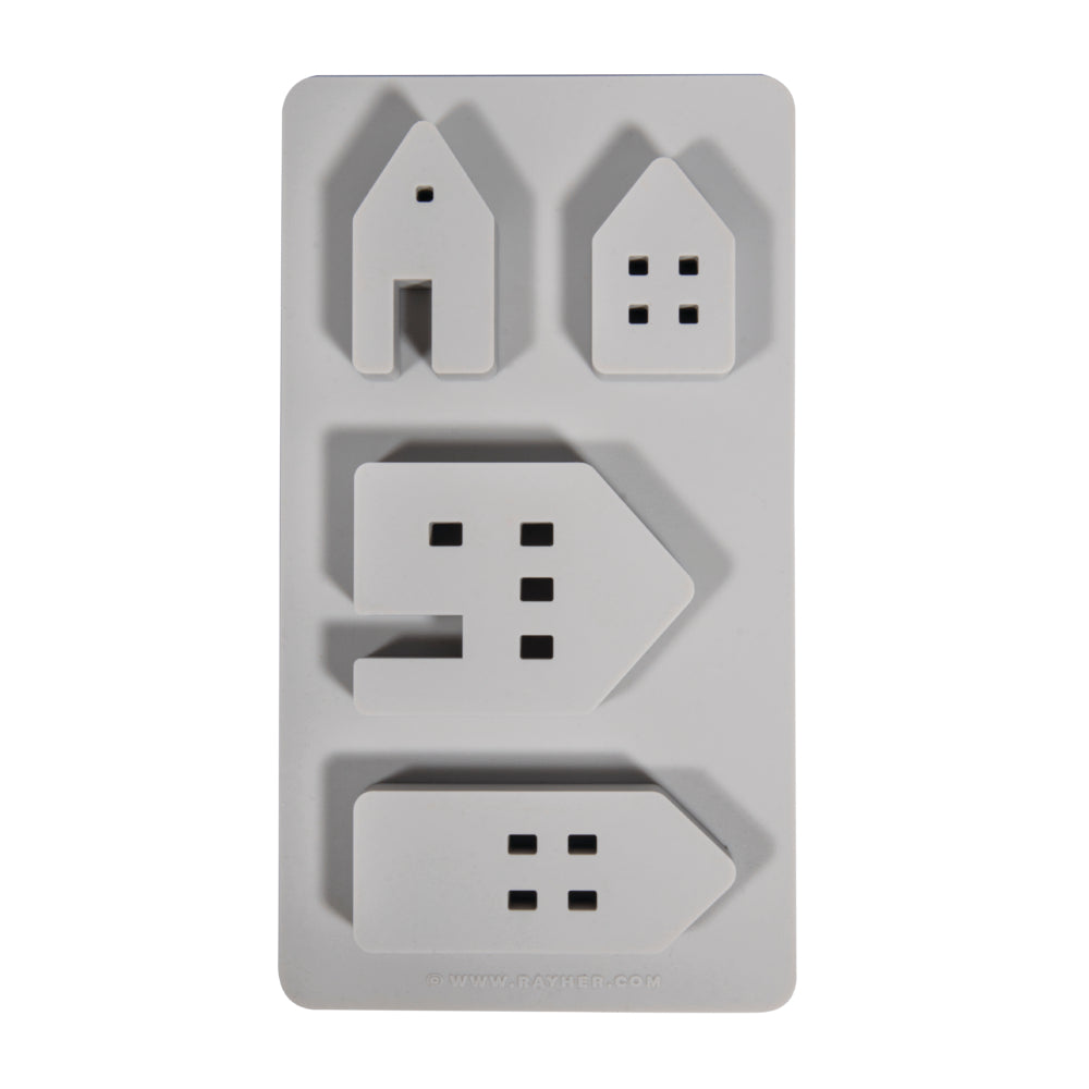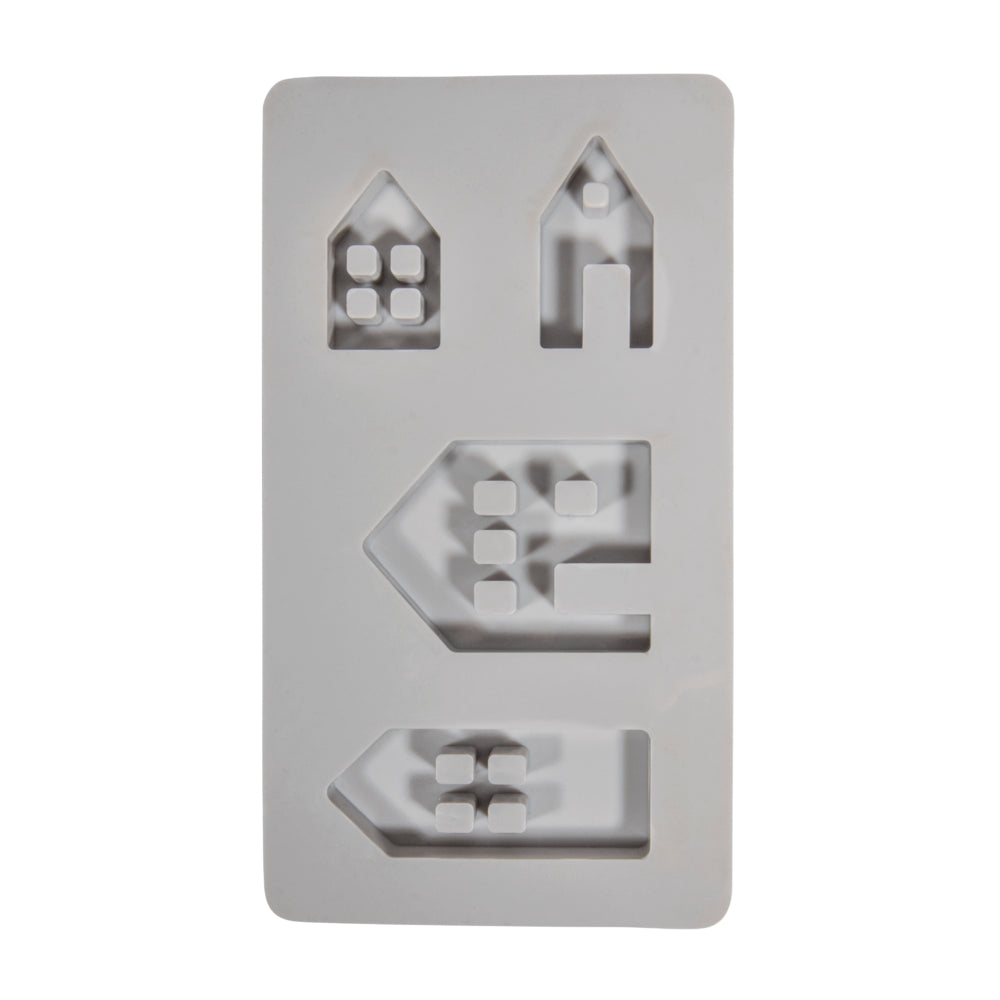 Mit der hochwertigen Silikon-Gießform gelingen vier Häuser, gegossen aus Kreativ-Beton, Schmuck-Beton, Raysin-Gießpulver, Gießharz oder Wachs. (Nicht für Lebensmittel geeignet).