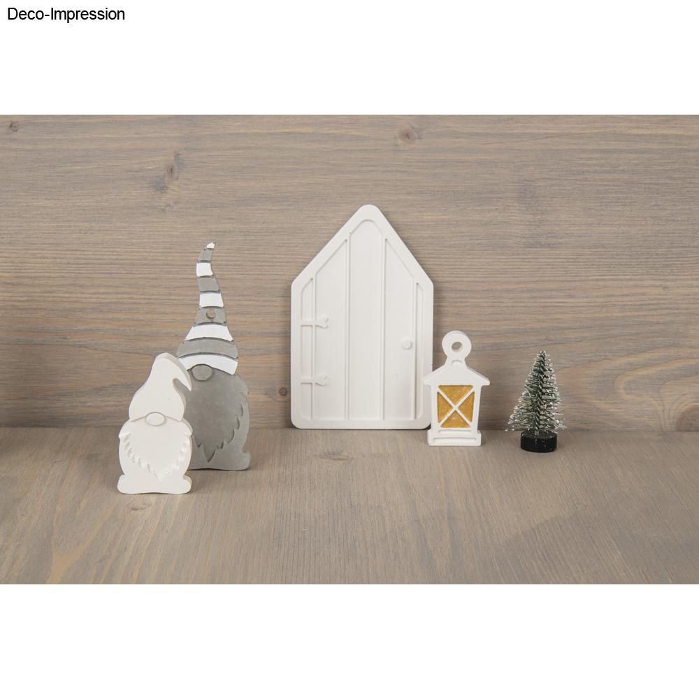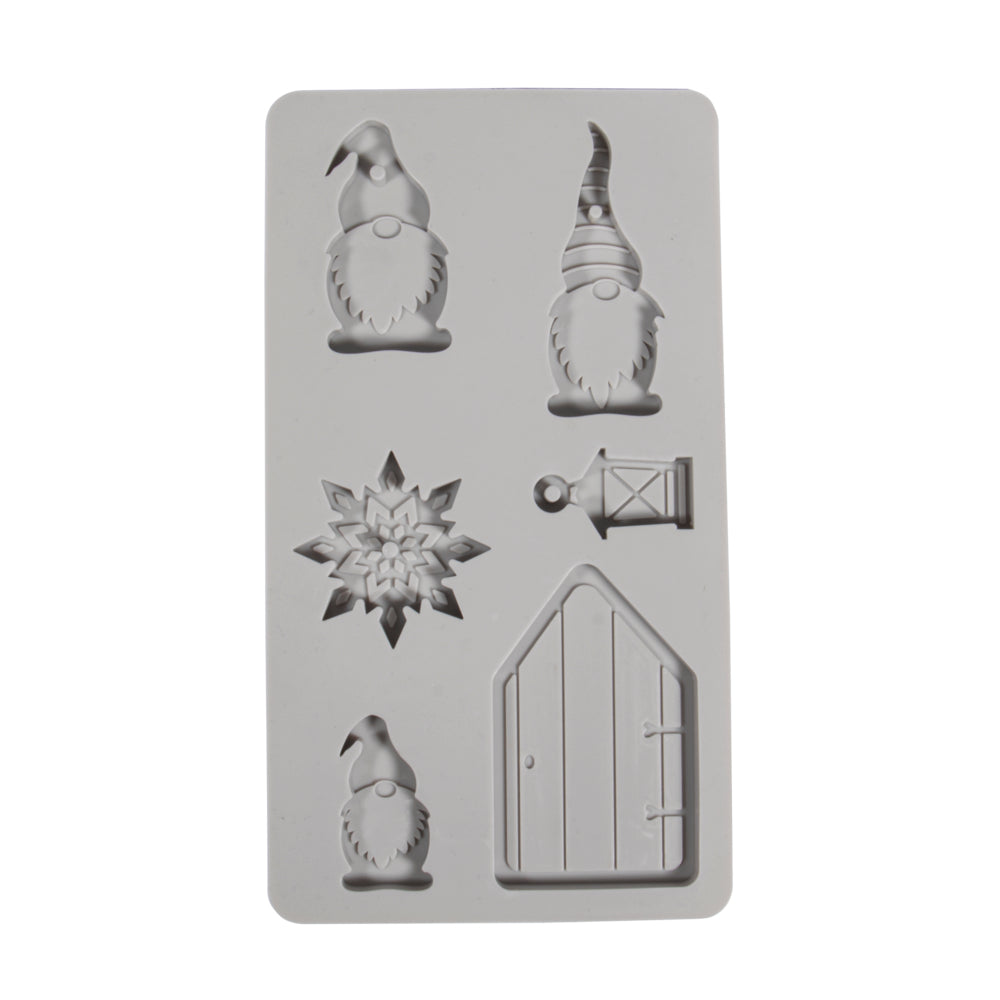 Silikon-Gießform 26 x 14,5 x 1 cm, 6 verschiedene Motive. Maße: Wichtel dick 39 x 75 mm, Wichtel lang 37 x 95 mm, Mini-Wichtel 28 x 54 mm, Laterne 29 x 50 mm, Schneeflocke 62 x 62 mm, Tür 64 x 101 mm, maximale Höhe 9 mm.