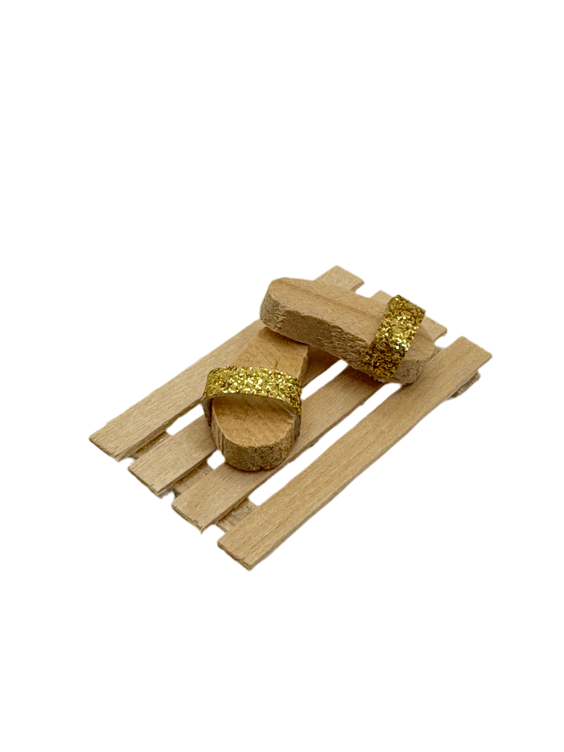 Miniatur Pantoffeln 2 tlg. 2,5 cm Naturholz mit Goldglitzer. Für Wichteltüren und Puppenhäuser.