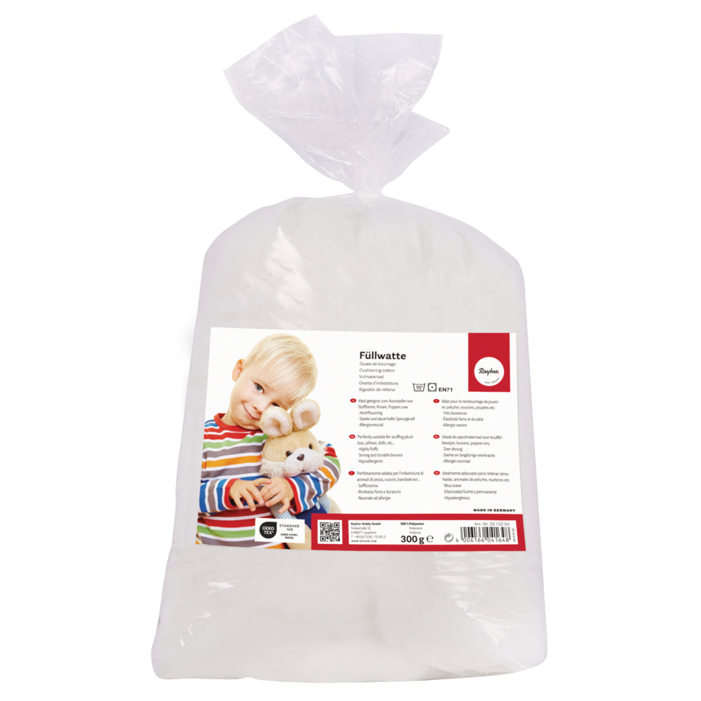 Hochflauschig, starke und dauerhafte Sprungkraft, reinweiß Langlebige Hochbausch-Spitzenqualität 100% Polyester Maschinenwaschbar bis zu 95° Trockner geeignet Allergieneutral Spielzeugnorm DIN EN 71-3 geprüft Geprüft nach Öko-Tex Standard 100 Die hochwertige Füllwatte ist in verschiedenen Abpackungen erhältlich, von 50g bis 500g. Ca. 200g werden z.B. für eine Puppe von 40 – 45 cm gebraucht.