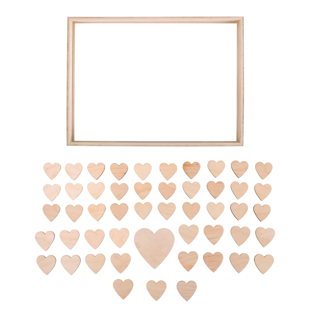 Holzrahmen zum Stellen 35 x 26 cm, Rahmentiefe 4 cm, inklusiv 2 Acrylglasscheiben, 50 Holzherzen (1x 9cm, 49x 4,5 cm).