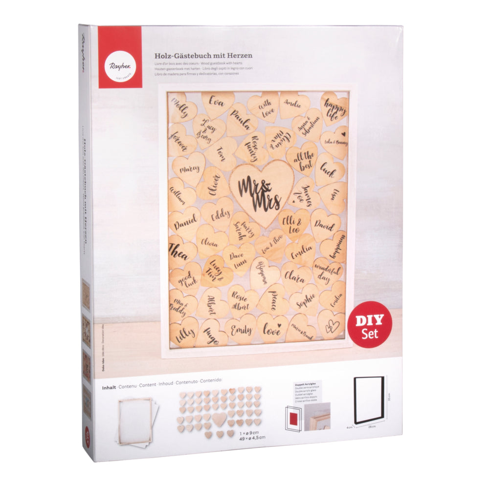 Auf den Holz-Herzen ist Platz für Namen, Wünsche und liebe Worte. Das fertig gestaltete Holz-Gästebuch mit Herzen ist gleichzeitig eine tolle Deko für dein Zuhause.
