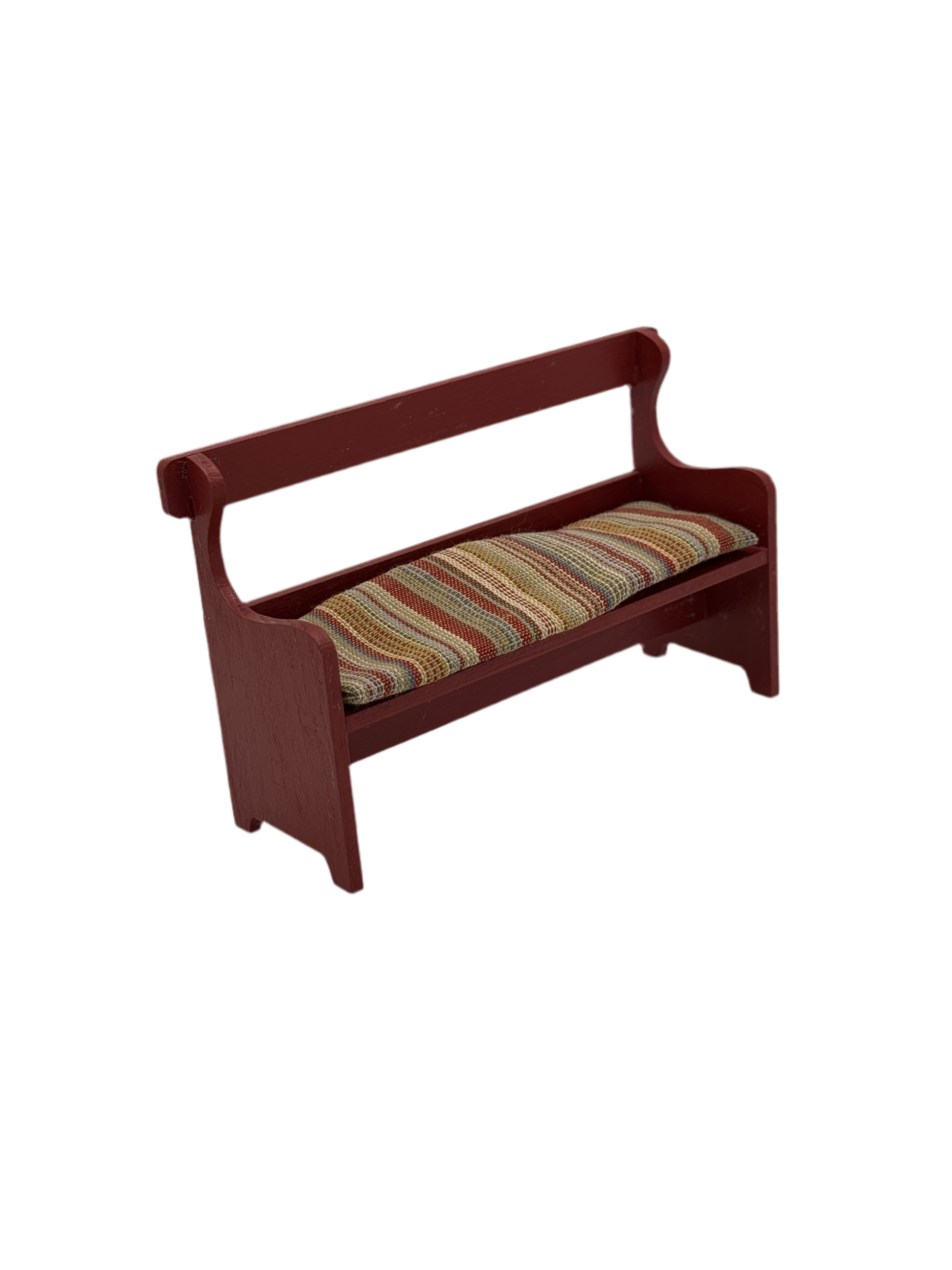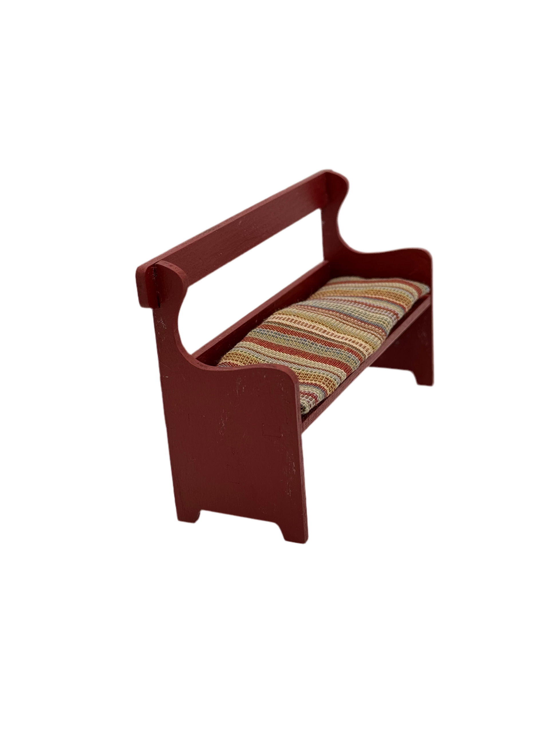 Eine Holzbank, die perfekt zur Mäusefamilie passt. Sie hat einen schönen handgemalten Vintage Look und ein weiches Kissen auf der Bank für einen bequemen Sitz. Abweichungen können auftreten. Passend für Wichtel, Maileg Mäuse und Puppenstuben.