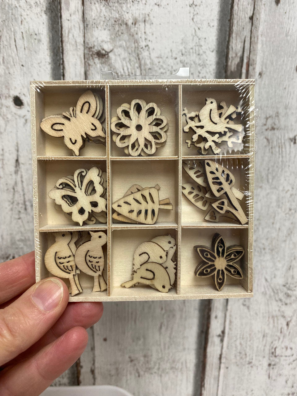 Holzbox Ornamente Streuer - Dekoriere mit diesen trendigen Holzornamenten! Die Holzbox enthält eine Vielzahl von Streuartikeln aus Holz, die jedem Anlass eine besondere Note verleihen. Egal ob als Tischdeko, Geschenkanhänger oder Bastelmaterial - mit dieser Box sind Ihrer Kreativität keine Grenzen gesetzt.