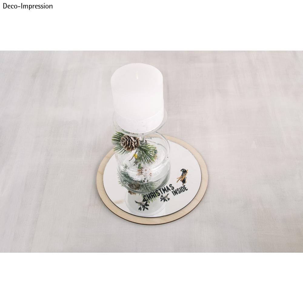 Zusätzlich benötigst du: Klebstoff, nach Wunsch Spiegelplatten rund, Farben, Flitter, Dekoelemente etc. und zum Beleuchten doppelseitiges Klebeband und eine Lichterkette.