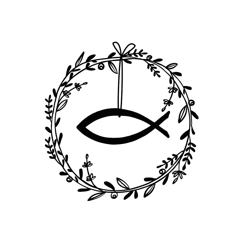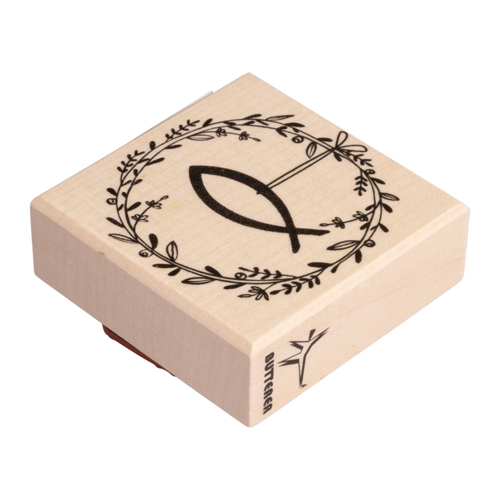 Butterer Holzstempel „Festtagskranz mit Fisch“, Klotzgröße 6 x 6 cm, das Stempelbild ist ca. 5 mm kleiner. Holzklotz kanadisches Ahornholz, Stempelplatte Naturkautschuk.