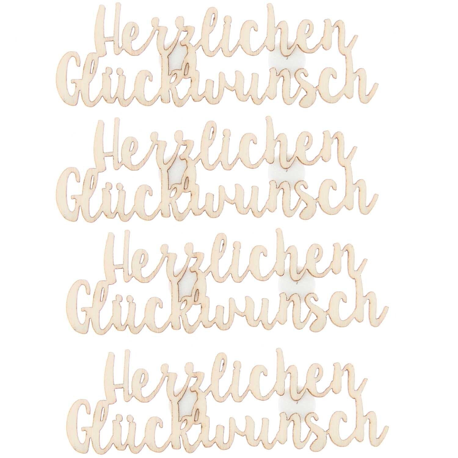 Holzsticker mit dem Schriftzug „Herzlichen Glückwunsch“ sind ideal zur Gestaltung von Grußkarten oder zur Verzierung von Geschenken und Verpackungen. Die Sticker verfügen über einen Klebepunkt auf der Rückseite zur einfachen Befestigung. Sie eignen sich auch hervorragend als Tischdekoration.