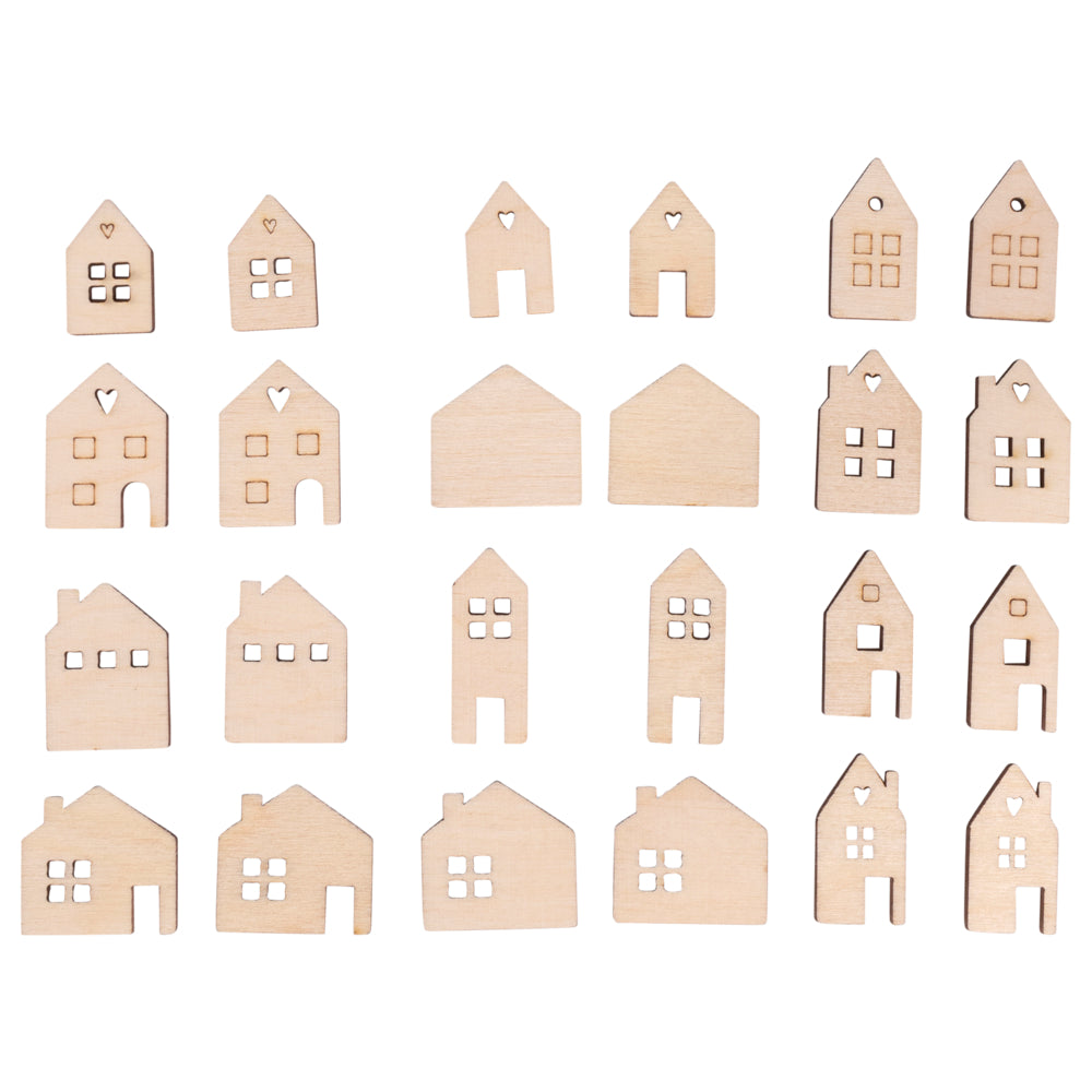 Inhalt: 24 Mini-Häuser aus Holz, Stärke ca. 2 mm, mit schönen braunen Rändern und verschiedenen Größen, ca. 2,5 – 3,5 cm. Hergestellt aus FSC-zertifiziertem Holz aus verantwortungsvoller Waldwirtschaft.