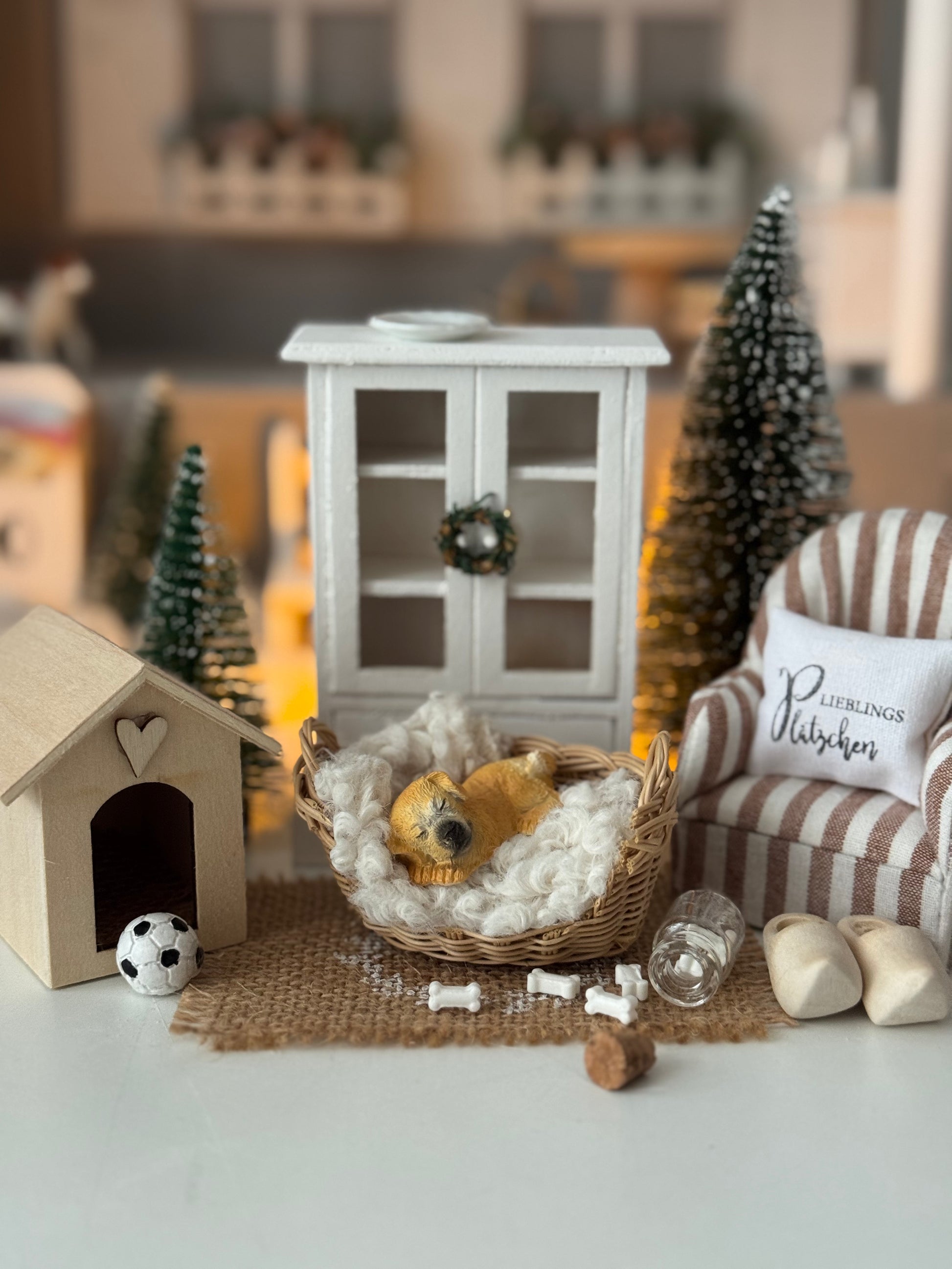 Wichtelzubehör für Hundefreunde. Diese Miniaturen sind ideal, um eine süße Hundeszene aufzubauen. Enthalten sind eine Hundehütte mit Herzchen, ein Körbchen mit kuscheliger Decke und Spielball sowie ein Miniatur-Gläschen mit Leckerlies, denn Hundeknochen im Miniformat dürfen hier natürlich nicht fehlen.