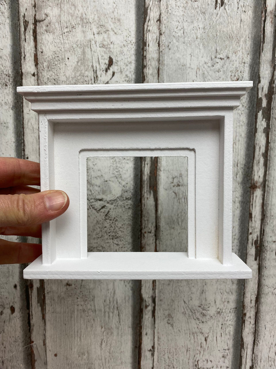 Richtig schicke weiße Kamin-Umrandung mit Ausschnitt. Hübsches Wichtelzubehör und auch perfekt für Puppenstuben und Maileg Maus. Die Kaminumrandung verleiht jeder Miniatur-Kulisse einen eleganten Touch.