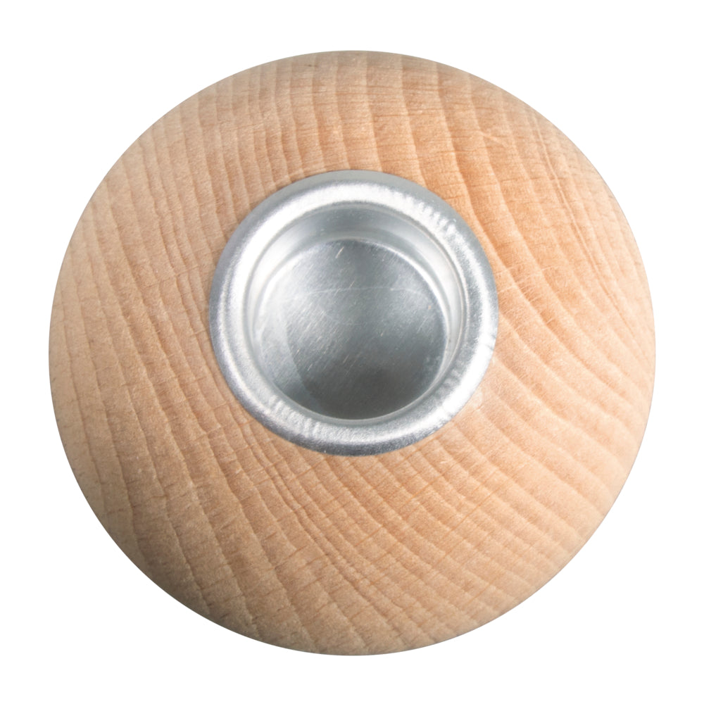 Rohholzkugel aus hochwertigem Buchenholz, 7 cm ø, mit flacher Unterseite und integriertem Kerzenhalter, passend für Kerzen mit ca. 22 mm ø. Erweiterbar durch mittige Durchbohrung (8 mm ø), zum Auffädeln von weiteren Kugeln oder Perlen.
