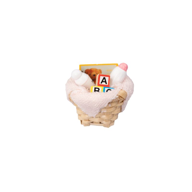 Dieses niedliche Baby-Körbchen in rosa ist perfekt für die Wichteltür oder das Puppenhaus. Es enthält eine kleine rosa Decke, winzige Bausteine, ein kleines Buch und ein zartes Puderfläschchen – alles sicher im Korb befestigt. So entsteht eine liebevolle Miniaturszene, die zum Träumen und Spielen einlädt! Ideal auch für Geldgeschenke zur Geburt.
