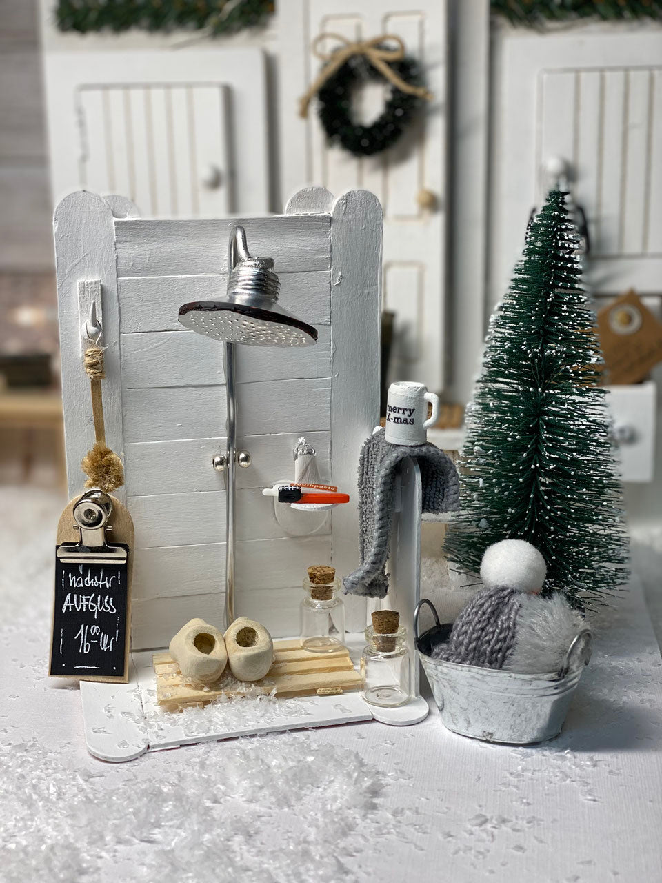 Dein Bastelset enthält: Bastelhölzer breit, Streichhölzer XXL, Leim, Klebeband, Pinsel, Farbe weiß, silberne Perlen, Holzperlen, Juteschnur, Silberdraht, Aludraht, Aluzuschnitt und die Dekoteile Zinkwanne, Zahnputzset und 2 Gläser mit Korkverschluss