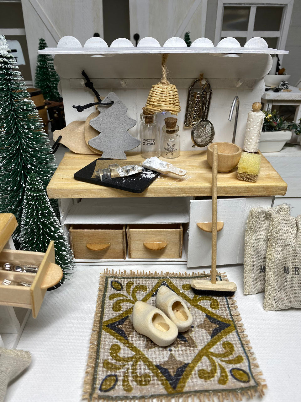 Dein Bastelset enthält: Bastelhölzer breit, Leim, TexiPap, Pinsel, Farbe, 1 Satz Küchenutensilien, Aludraht, Perle, Körbchen, Juteschnur, 2 Gläser, Klettverschluß, Regal, 1 LED Kugel, Handtuch und Schwämmchen