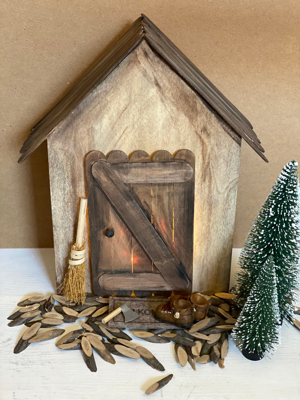 Dein Kreativset Wichteltür Hexenhaus enthält: 1 Haus, Farbe schwarz und braun, Bastelhölzer, Schaumpads, Kugel (Griff), 10 Lichterkette am Draht, Besen, Leim