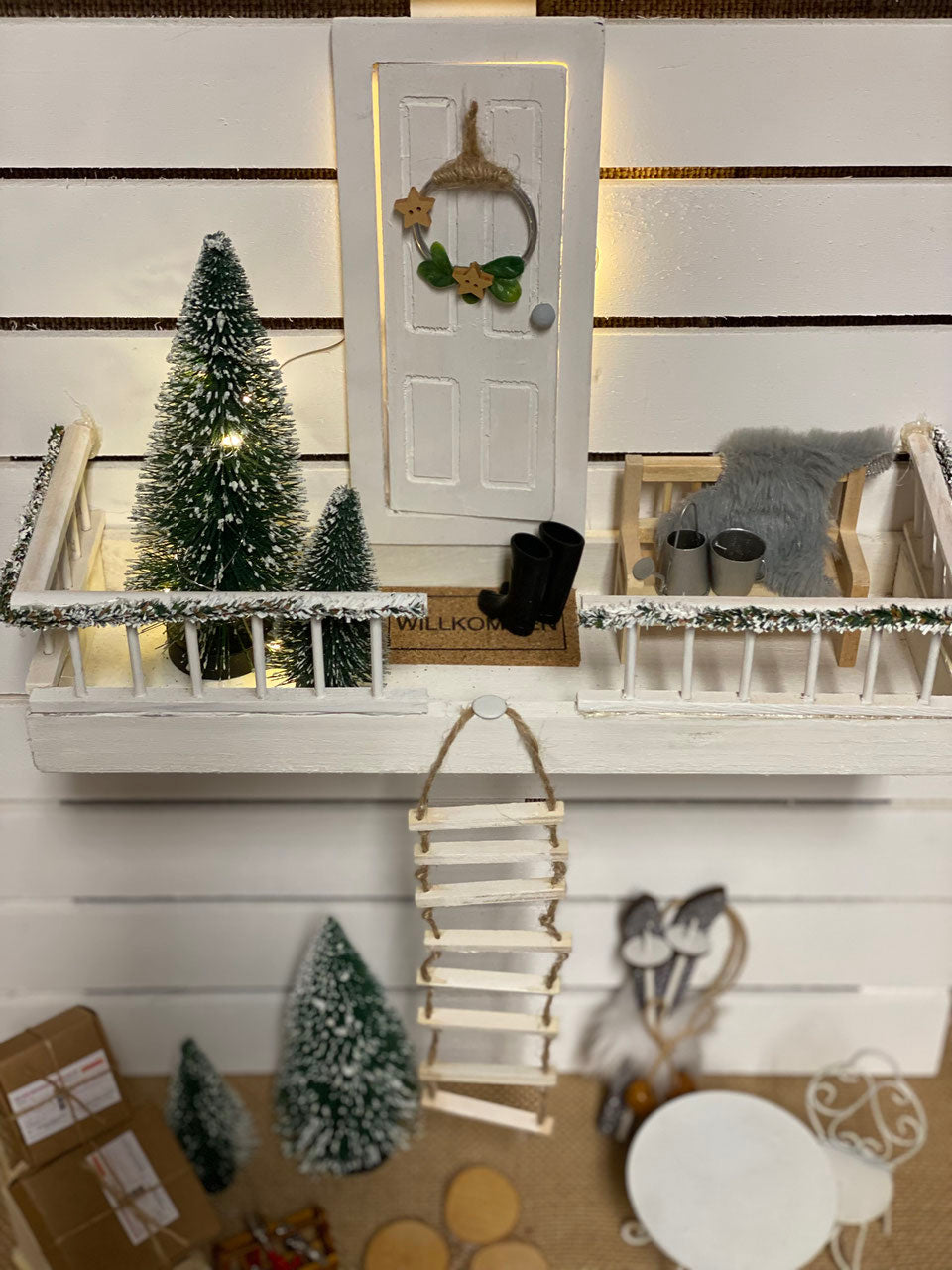 Dein Kreativset enthält: Bretterrückwand 40cmx50cm, Balkonplatte 29,5cmx10,3cmx2,3cm, 4 Leitern, Strickleiter, Wichteltür, Farbe in weiß und Pinsel