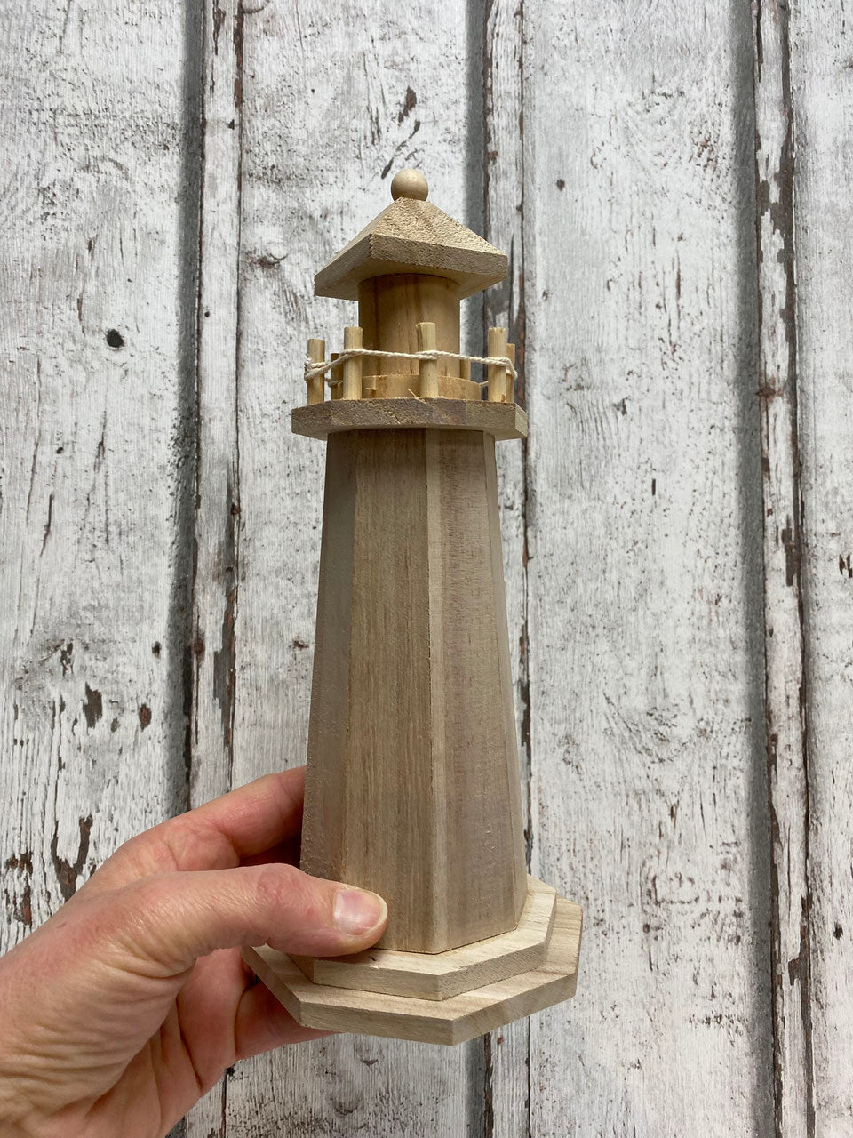 Dieser wunderschöne Leuchtturm aus Holz ist ideal für Liebhaber maritimer Dekoration. Mit seiner perfekten Größe und seiner glatten Oberfläche eignet er sich perfekt zum Bemalen und ist somit ein individuelles und einzigartiges Dekoobjekt. Holen Sie sich das maritime Flair nach Hause