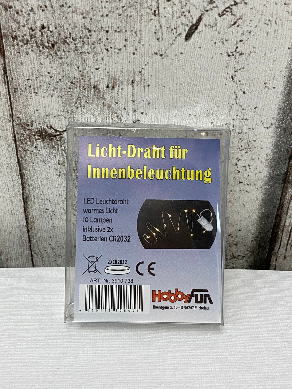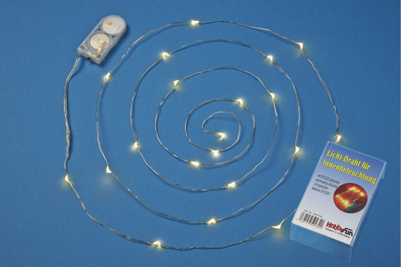 LED Lichterdraht warmweißes Licht mit flachem Batteriekasten (2x CR2032) Die Lampen sind auf einem sehr flexiblem silbernen Draht befestigt. Zur Beleuchtung von Wichteltüren und Puppenhäusern. Zum Bauen und Basteln von Miniatur-Kulissen.