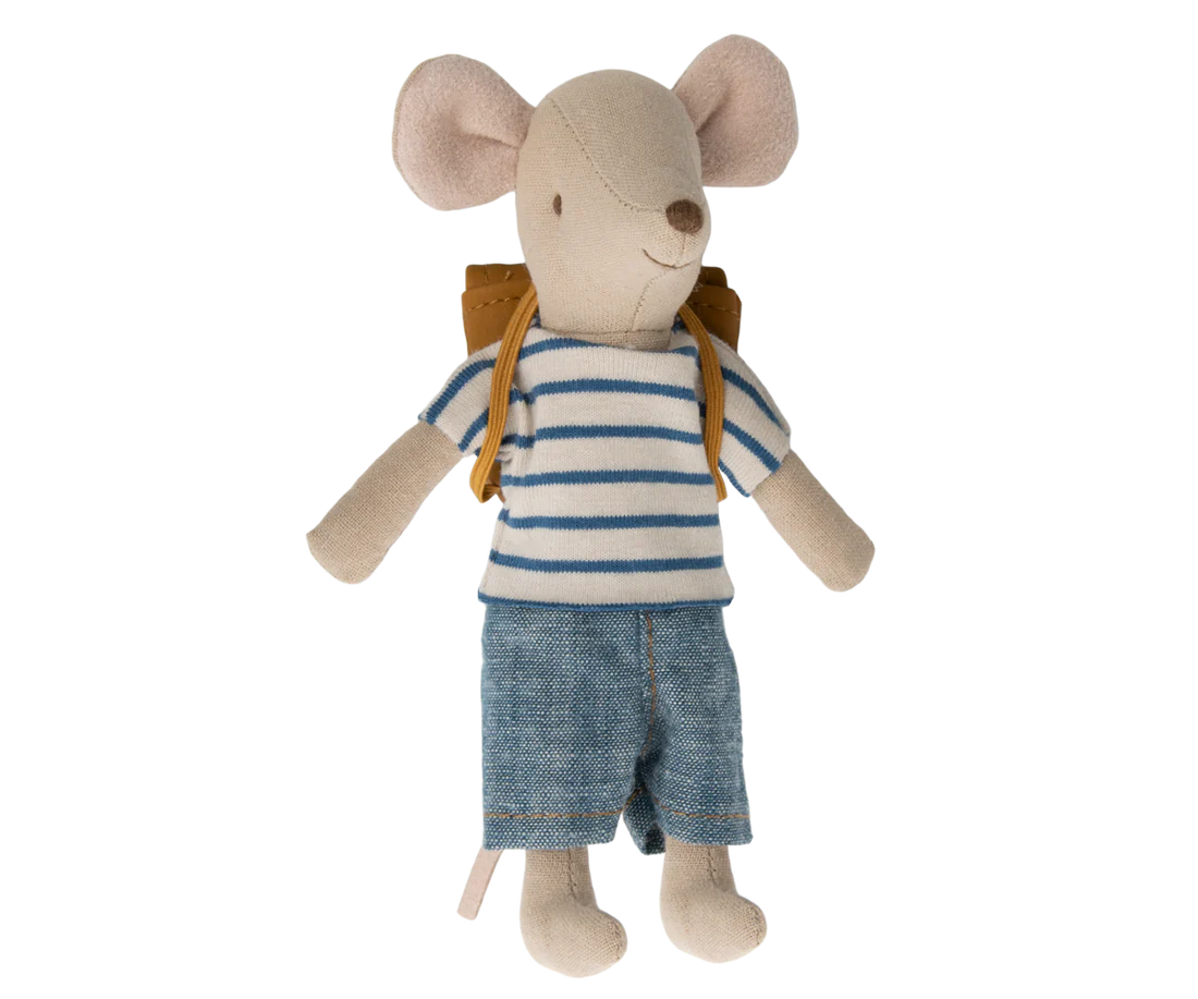 Großer Bruder Maus ist für einen Tag im Kindergarten oder in der Schule angezogen und trägt seinen Rucksack auf dem Rücken. Er hat Magnete in seinen Händen, damit er die Griffe des Dreirads für eine schnelle Fahrt halten kann.