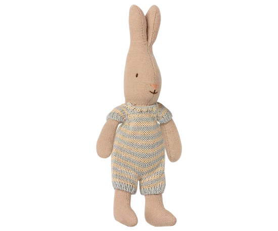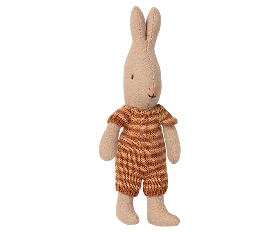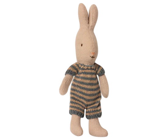 Dieses süße Häschen in Mikrogröße trägt einen gestreiften Anzug, der aus einer weichen Leinen-/Baumwollmischung gestrickt ist.