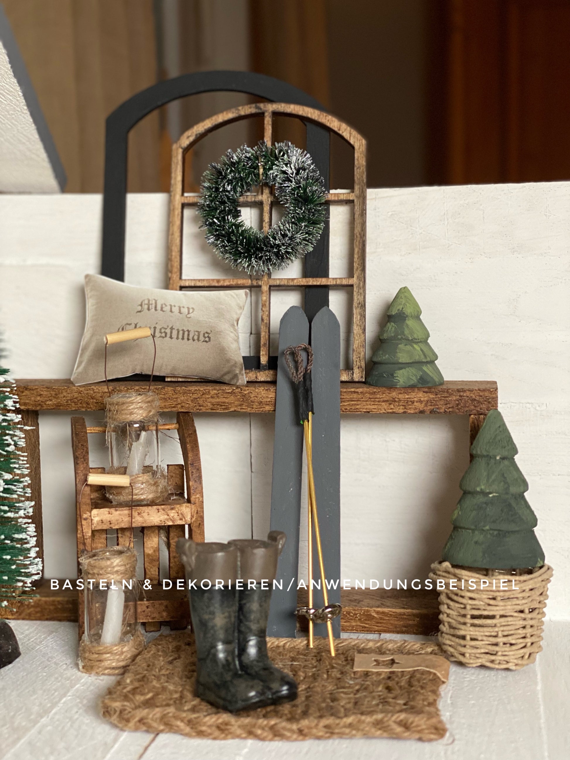 Miniatur Skier 10 cm, 4 Teile. Diese winzigen Skier, liebevoll gestaltet in Weiß und Grün, sind das perfekte Accessoire für deine winterliche Wichtelkulisse oder für dein Puppenhaus. Die Skier können mit unseren Acrylfarben bemalt werden.