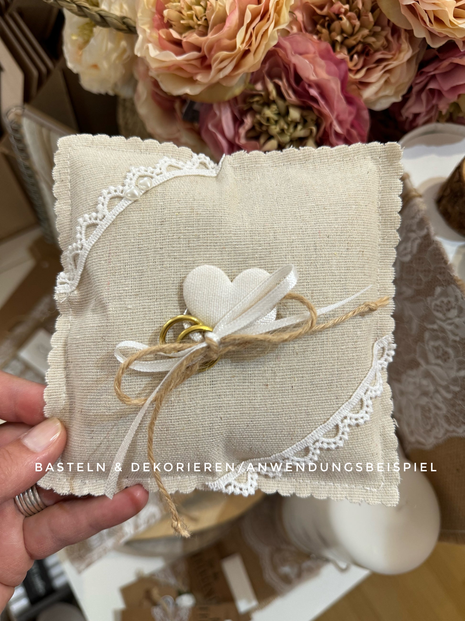 Diese bezaubernden Ringkissen in Leinenoptik sind das perfekte Accessoire für deine Hochzeit. Die schlichte Optik verleiht deinem großen Tag eine besondere Note. Eine sichere Aufbewahrung deiner Ringe auf dem Weg zum Altar.