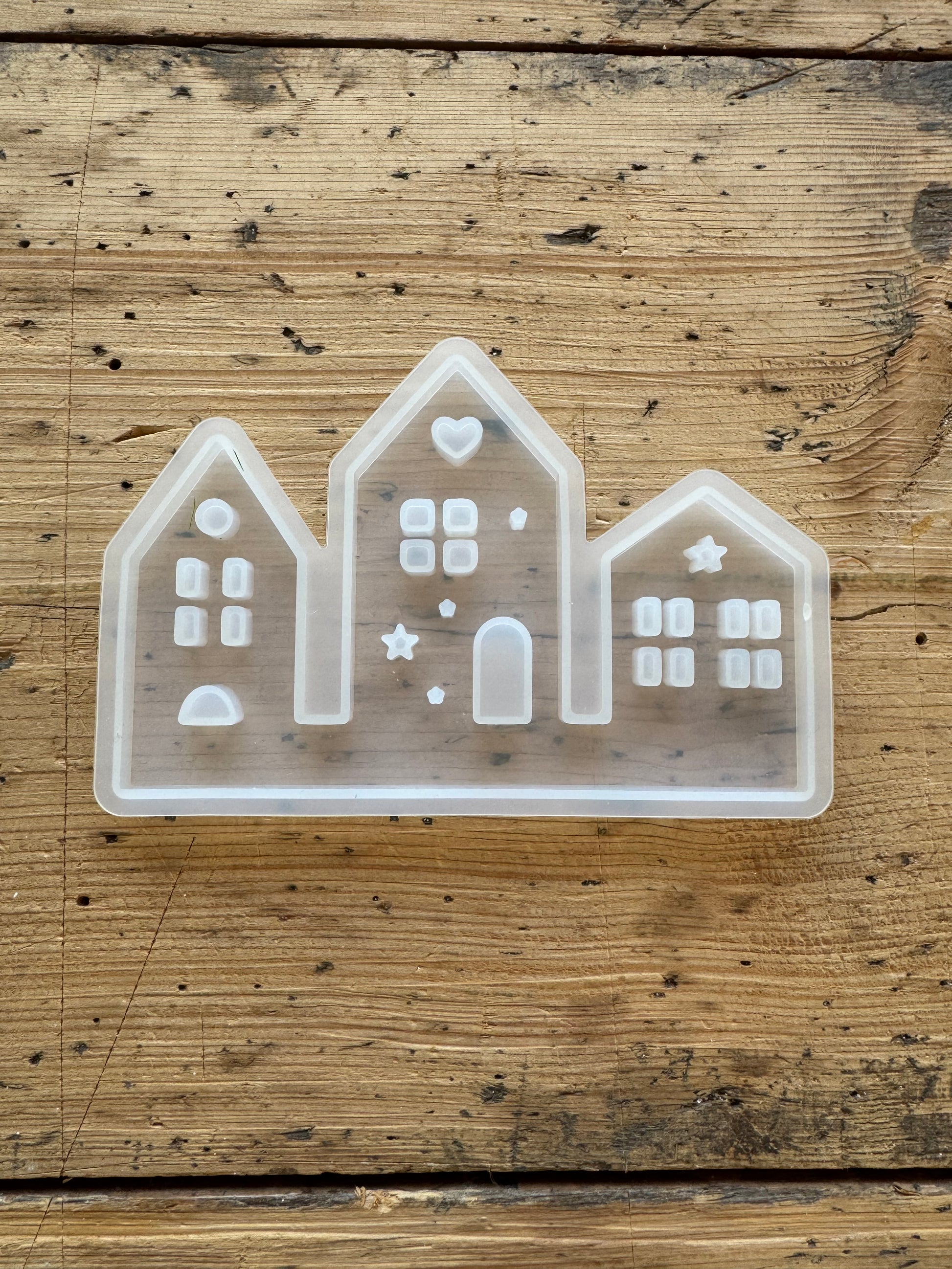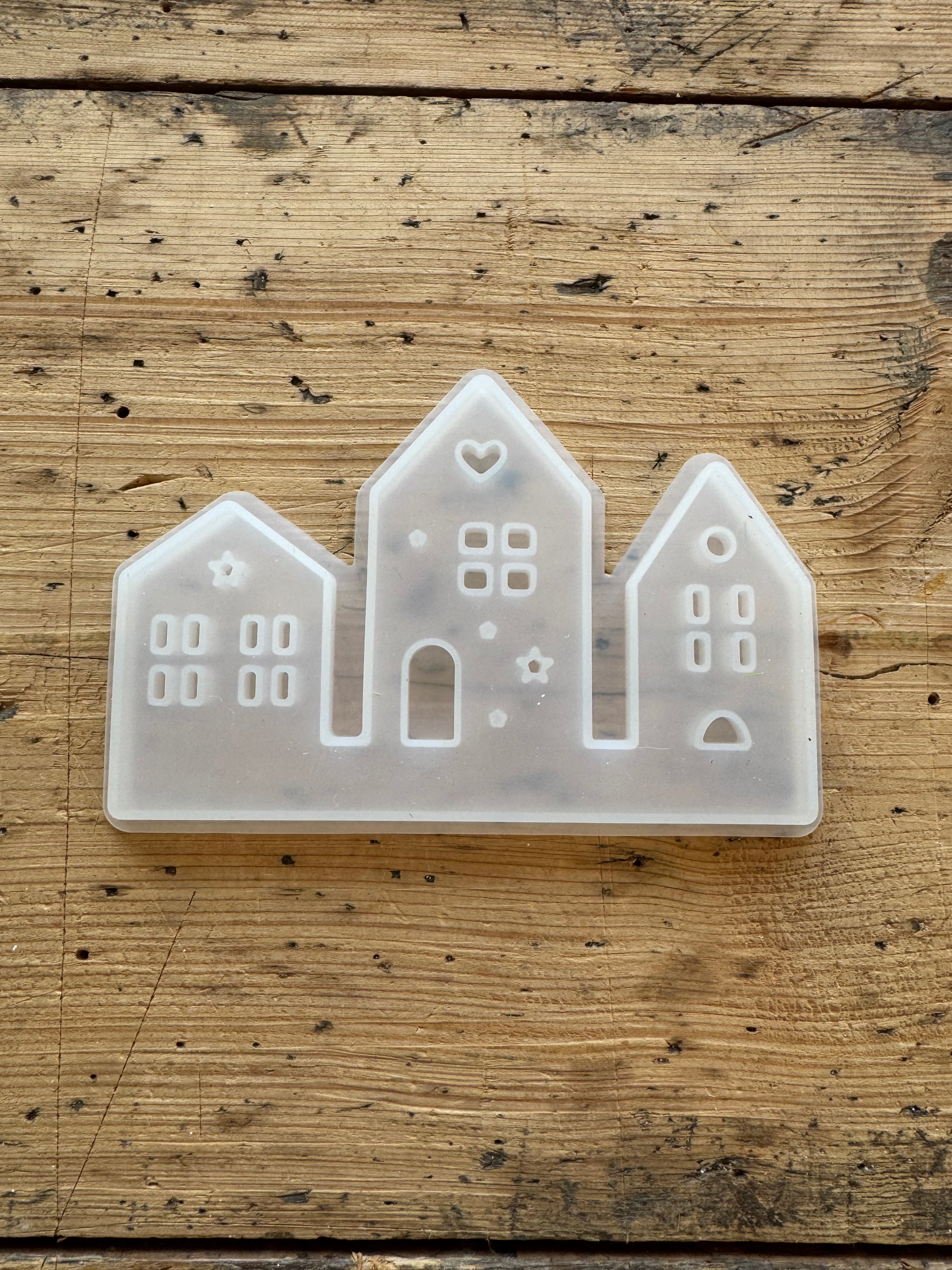 Gießform Häuser flach 3-fach aus hochwertigem Silikon, besonders elastisches, stabiles Material. Wiederverwendbar. Sehr leicht zu entformen und formstabil. Ein schönes Mitbringsel für einen besonderen Anlass.