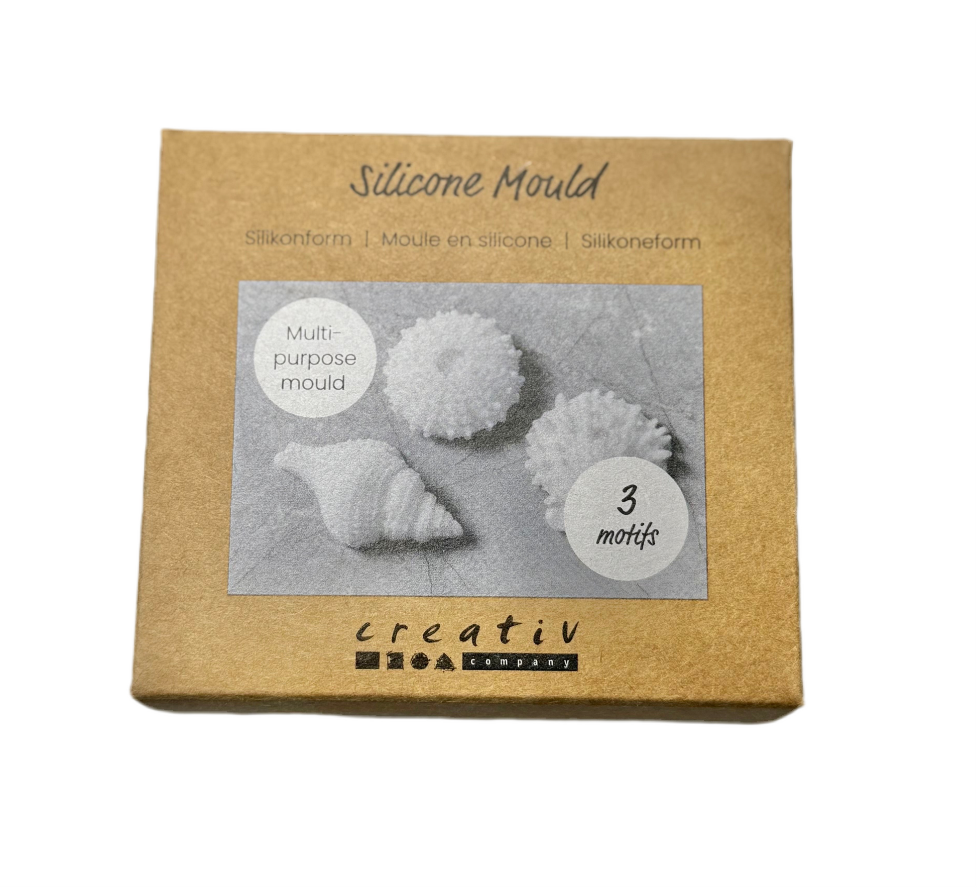 Silikon-Gießform Seeigel, Schneckenmuschel und Muschel. Die Form kann zum Formen von Beton, Raysin und Seife verwendet werden. Hitzebeständig bis 230 °C.