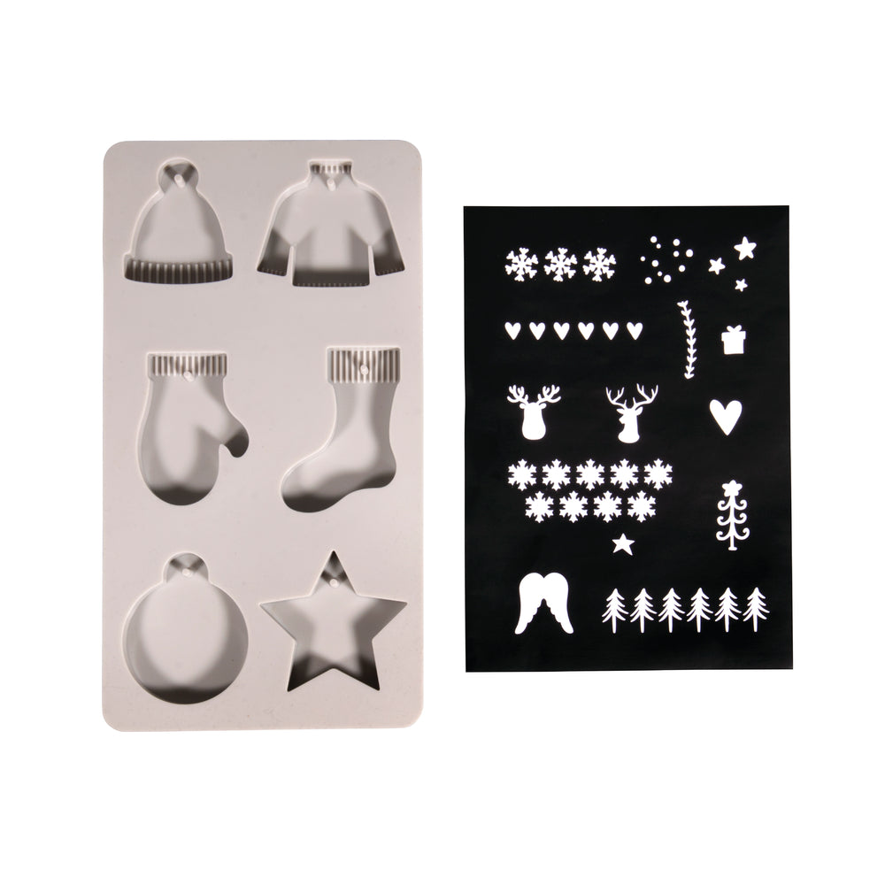 Weihnachtliche Motive auf den trockenen Formen gelingen dir mit der selbstklebenden, wiederverwendbaren Schablone (Form Winter) aus dünnem Kunststoff. Motive einfach ausschneiden, auf Motiv andrücken, bemalen, reinigen und danach auf der Trägerfolie aufbewahren.