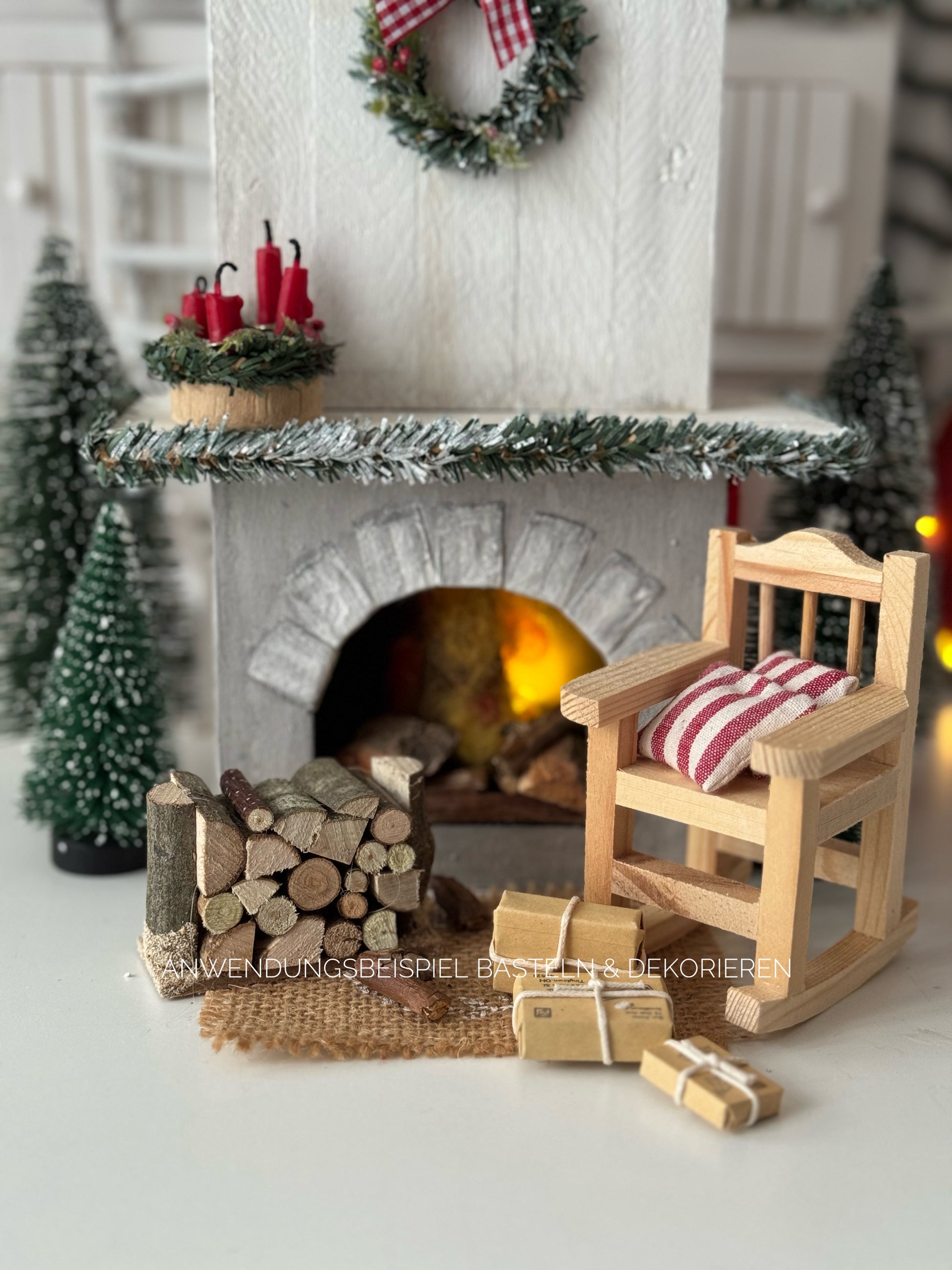 Dieser kleine Holzstoß ist die perfekte Dekoration für Wichteltüren, Puppenhäuser und Krippen. Er sorgt dafür, dass der Wichtel im Winter warme Füße behält, während er gemütlich in seinem Schaukelstuhl vor dem Kamin sitzt. Ideal, um die Miniaturwelt mit noch mehr Charme zu beleben – stelle dazu Wichtelschuhe, Kissen und kuschelige Teppiche bereit und dekoriere eine heimelige Szene.