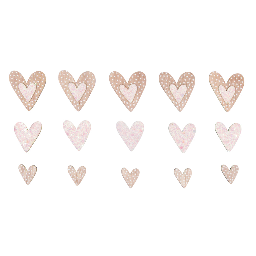 Inhalt: 15 Holzstreuteile Herzen in 3 verschiedenen Größen, mit zarten weißen Punkten und Glittereffekten.