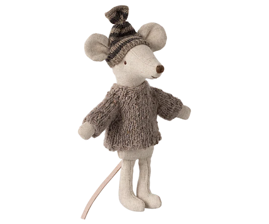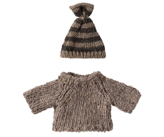 Ein weicher Strickpullover und eine Mütze für die kalte Winterzeit. Dies wird deine kleinen Freunde sicher warm halten. Die Sets passen den Mäusen in der Größe Große Schwester/ Großer Bruder. Passend für Puppenhäuser und Wichtel.