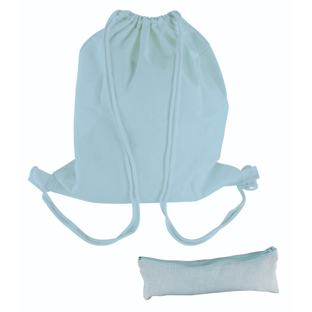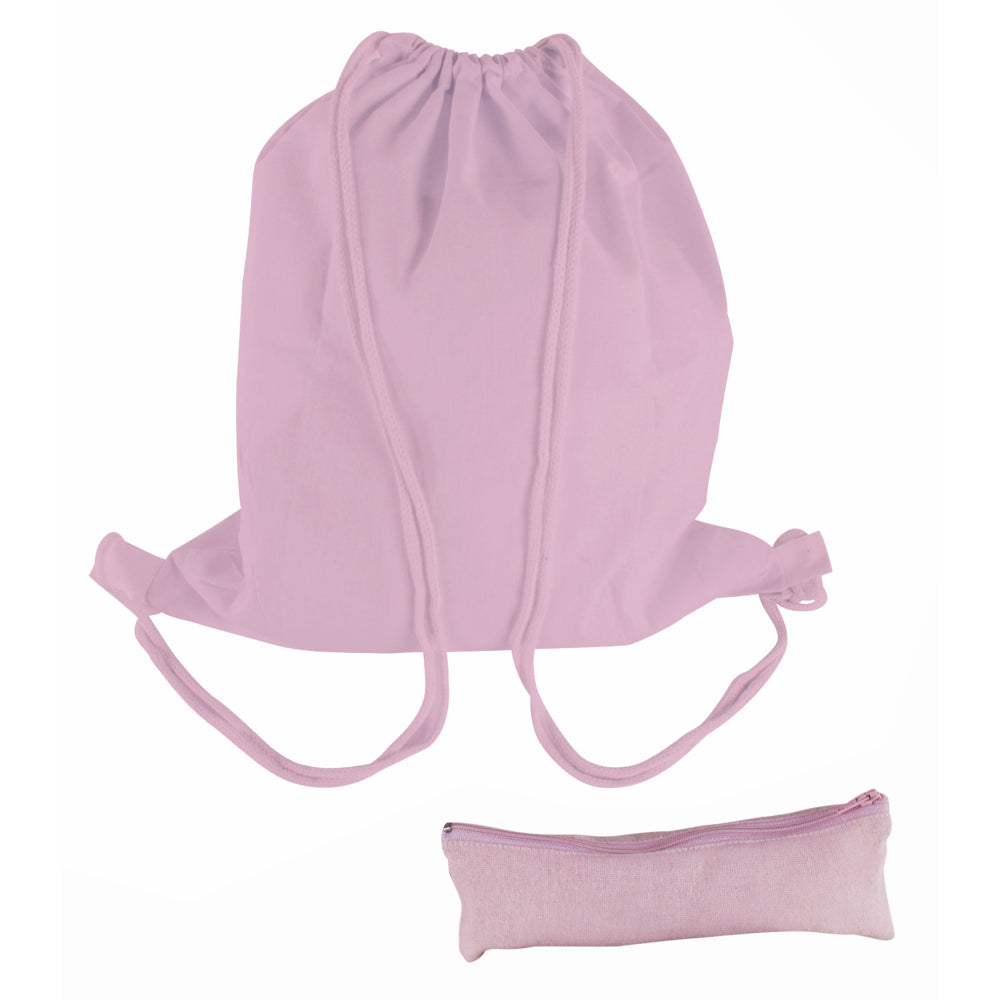 Turnbeutel mit Kordelzug, 38x42cm (Breite/Höhe), Stiftetasche mit Reißverschluss 21x8cm (Breite/Höhe), in rosé oder hellblau erhältlich. Der Stoff ist bei 30°C waschbar (Schonwaschgang), bügelbar (Niedrigtemperatur, 110°C), Trockner geeignet (Niedrigtemperatur, schonend). Kann nicht gebleicht und chemisch gereinigt werden.