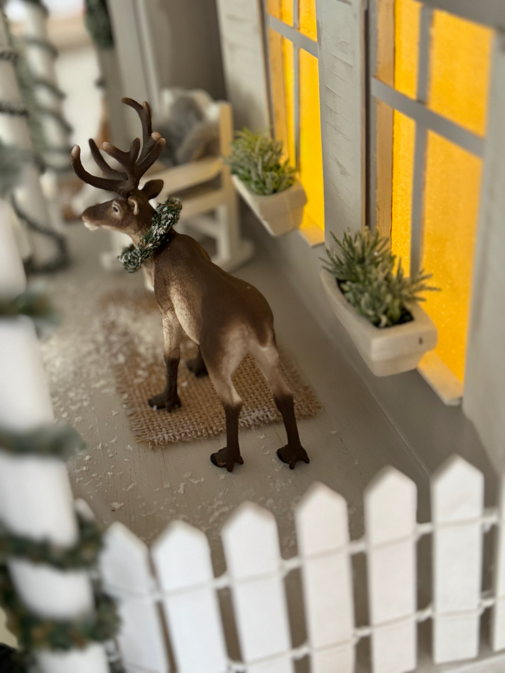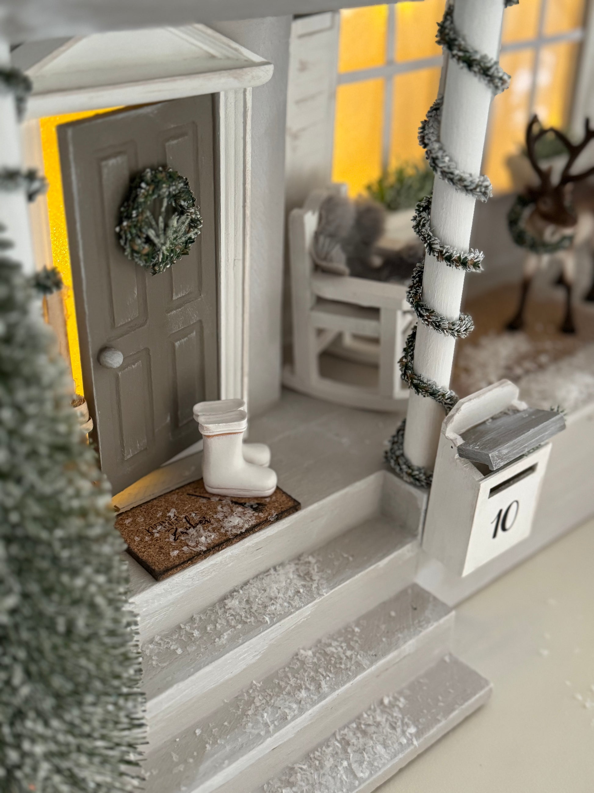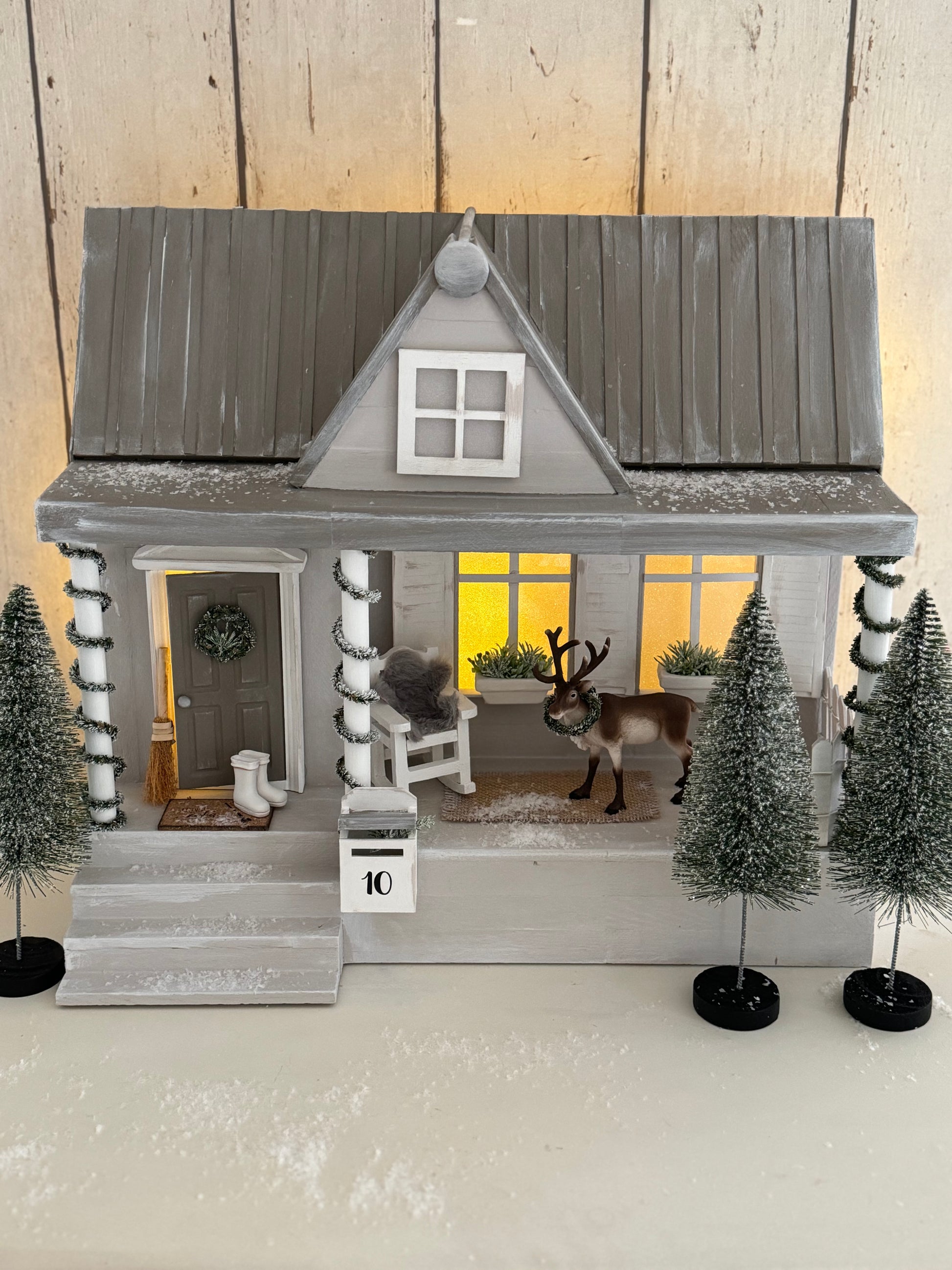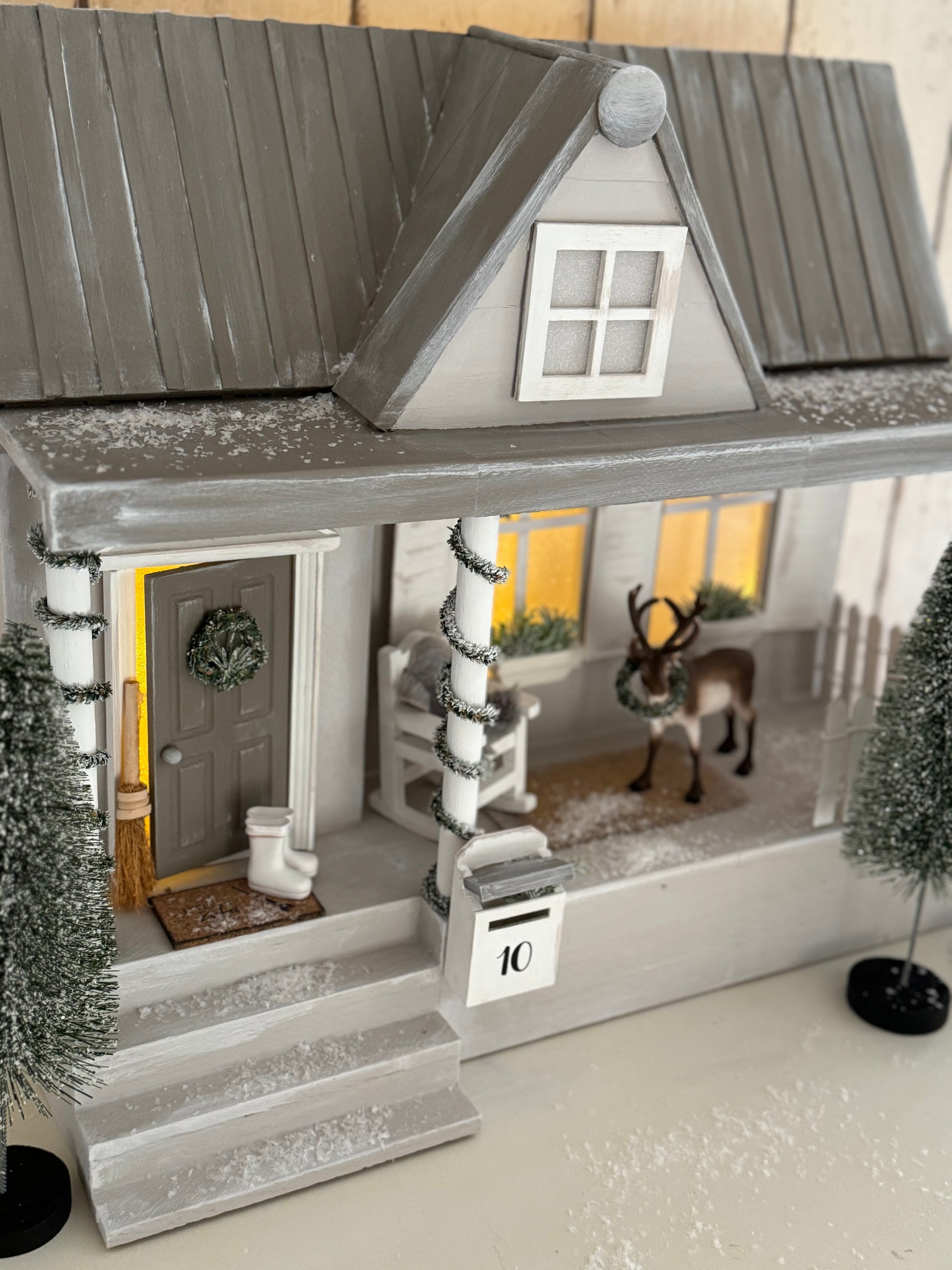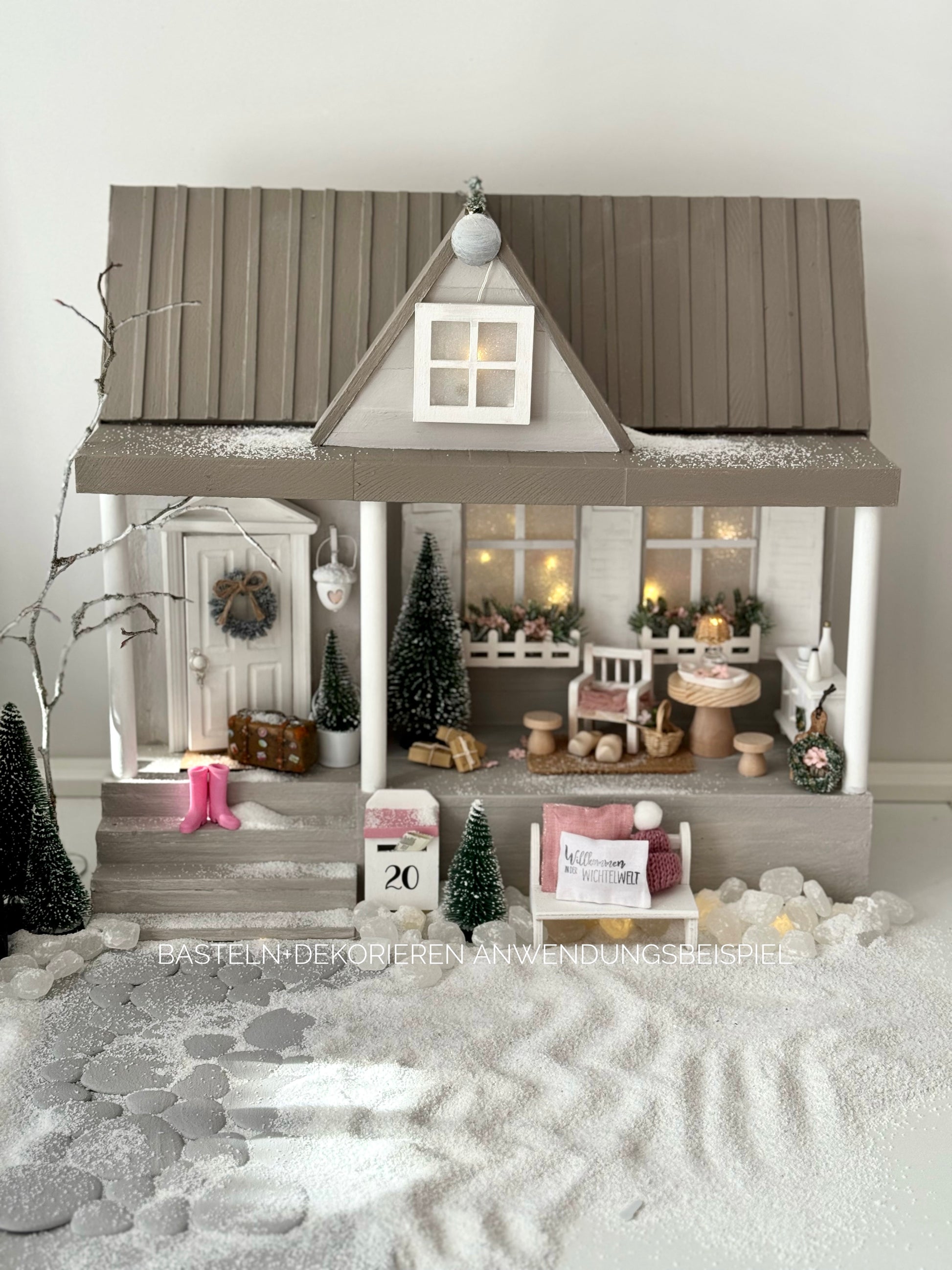 Das Paket enthält alle Materialien, um ein Landhaus mit Terrasse zu basteln. Tür, Lichterkette, Tannenranke und Zaun incl.