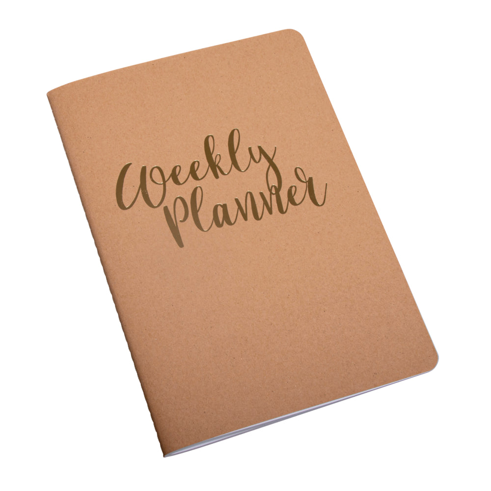 Einband aus braunem Kraftpapier mit goldenem Schriftzug „Weekly Planner“