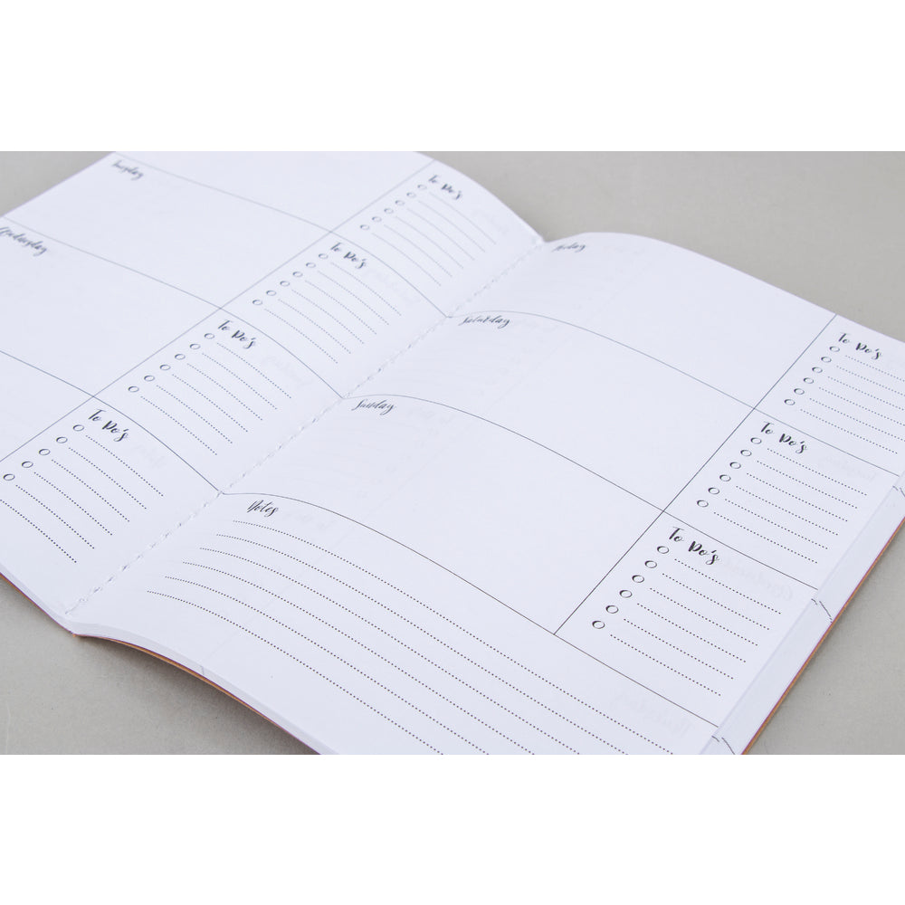 Von Montag bis Sonntag, mit viel Platz für tägliche Notizen und to do’s. Und zusätzliche Spalten für Gedankenblitze, Erinnerungen und vieles mehr.