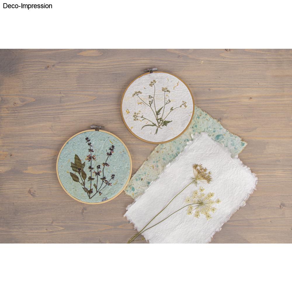 Reichweite: 1 Platte ergibt ca. 6 geschöpfte, weiße Papiere im Format 15x24cm, d.h. die 5 Platten ergeben ca. 30 Papiere in diesem Format.